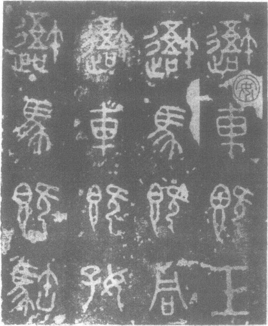 战国时代的秦国文字,后世许多学者把它叫做“籀〔zhou皱〕文”或者“大篆〔zhuan赚〕”,是相当工整的一种文字,比起西周和春秋时代的金文,变化也不算太大。这种字,可以用唐代时出土于该地区的《石鼓文》作为代表(图21)。
