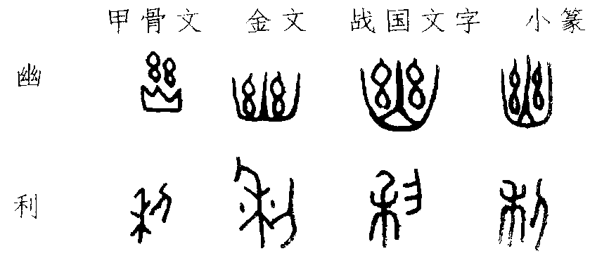 (2) 笔画定型:由甲骨文、金文 、战国文字的笔画方圆粗细不等,变成均匀圆转的线条。如: