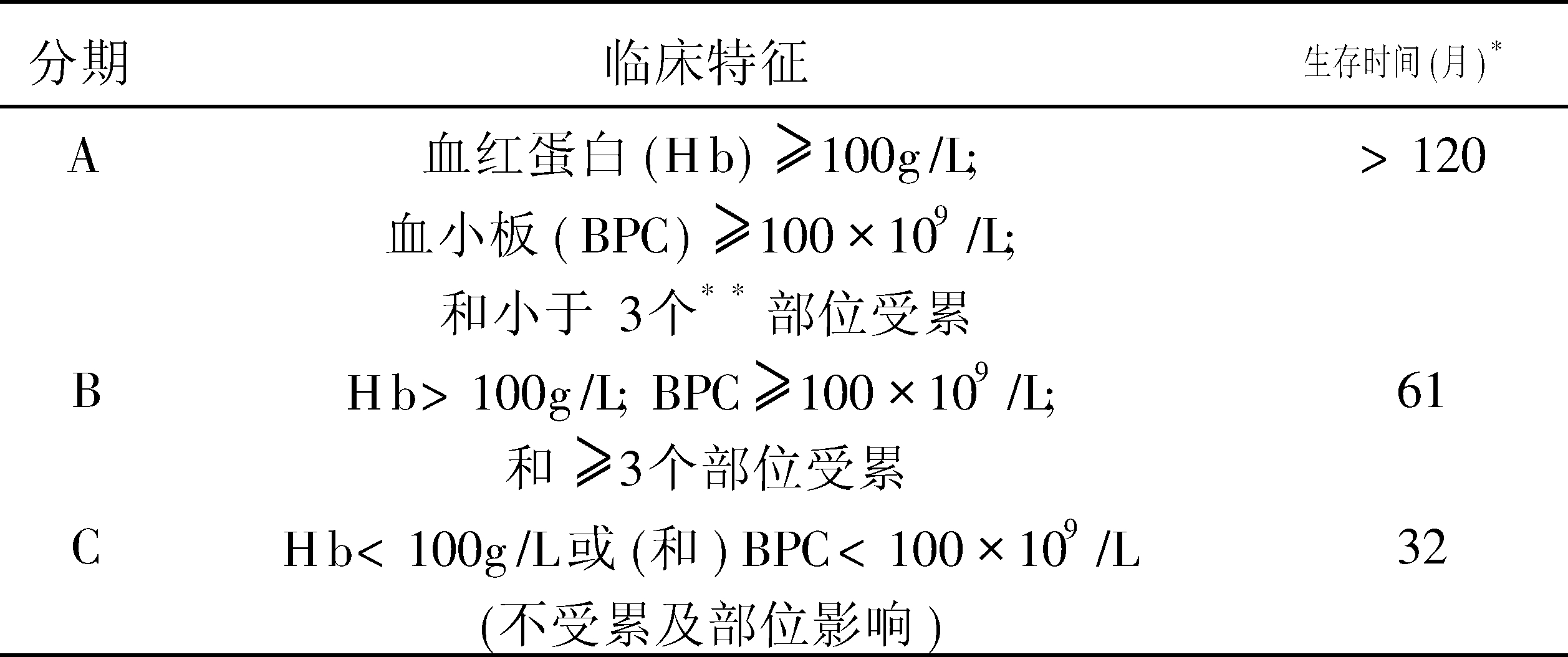现在使用Rai和Binet两个分期系统各有优缺点。CLL国际专题讨论会推荐把Binet和Rai方案综合如下:A(0)、A(Ⅰ)、A(Ⅱ);B(Ⅰ)、B(Ⅱ)和C(Ⅲ)、C(Ⅳ)。