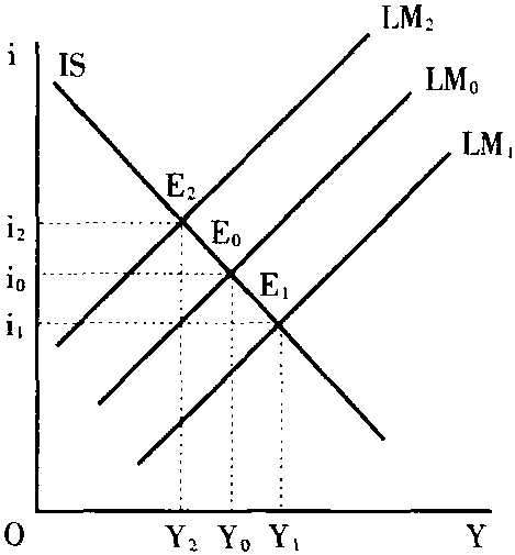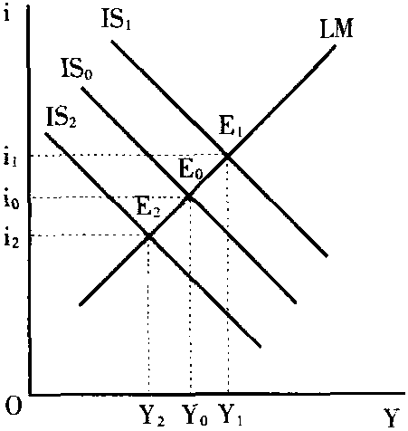 ☚ LM曲线 工资菲利普斯曲线 ☛ IS-LM模型 IS-LM模型IS-LM model说明商品市场与货币市场同时达到均衡时国民收入与利率的决定的模型。在图1中,横轴代表国民收入(Y),纵轴代表利率(i)。IS曲线上的任何一点都是商品市场的均衡,即I(投资)=S(储蓄)。LM曲线上的任何一点都是货币市场的均衡,即L(货币需求)=M(货币供给)。IS曲线与LM曲线相交于E,这时决定的国民收入(Y0)与利率(i0)使得商品市场与货币市场同时实现了均衡。这一模型包括了凯恩斯分析国民收入决定时所包括的4个变量:消费(或收入减消费的余额储蓄)、投资、货币需求、货币供给,并用均衡分析的方法同时分析了这4个变量如何决定国民收入与利率。根据这一模型可以说明财政政策与货币政策对国民收入与利率的影响。图2表示,当财政支出增加(即实行扩张性财政政策),从而总需求增加时,IS曲线从IS0向右移动到IS1,这就引起国民收入从Y0增加到Y1,利率从i0上升到i1。反之,当财政支出减少(即实行紧缩性财政政策),从而总需求减少时,IS曲线从IS0向左移动到IS2,这就引起国民收入从Y0减少至Y2,利率从i0下降到i2。图3表示,当货币供给量增加(即实行扩张性货币政策)时,LM曲线从LM0向右下方从LM0移动到LM1,这就引起国民收入从Y0增加到Y1,利率从i0下降到i1。反之,当货币供给量减