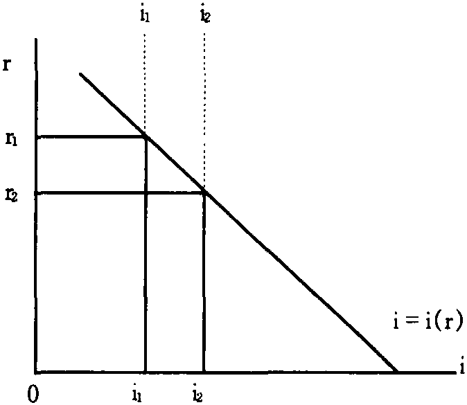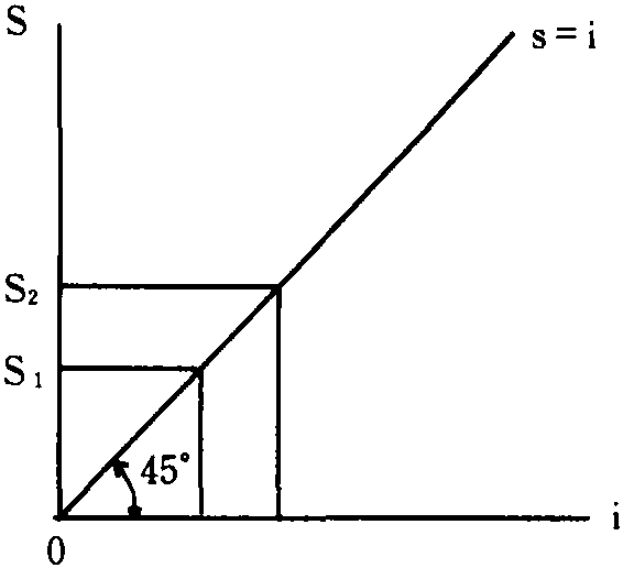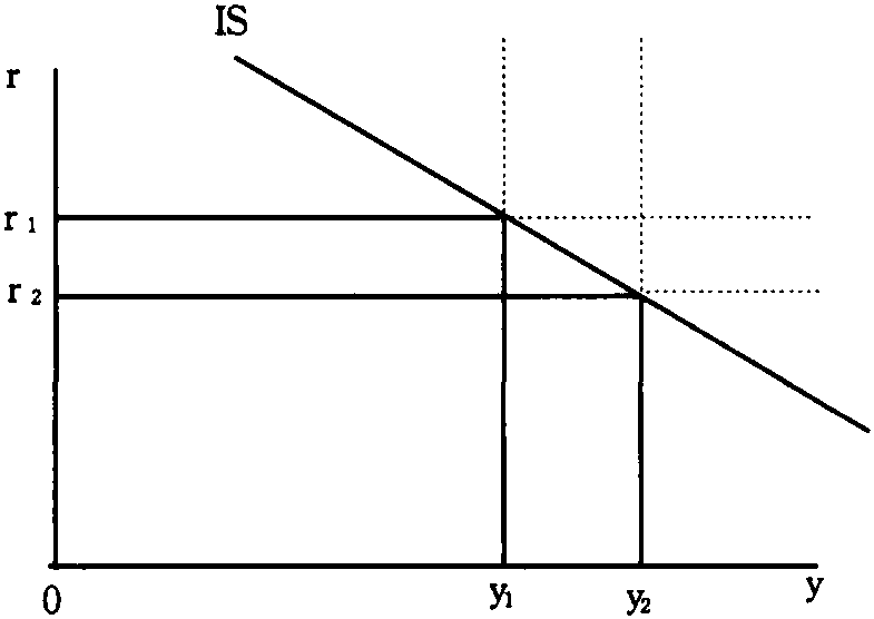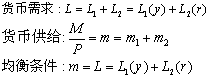 图1(c) IS曲线上的每一个点都表示在投资等于储蓄时的收入和利率的一个组合。在产品市场中,IS曲线上的每一个点都表示储蓄等于投资,为了满足产品市场的均衡条件,利率水平必须同收入水平相配合。因此,IS曲线表示的是使投资等于储蓄的收入和利润的各种组合。一般地说,位于IS曲线右方的收入和利率组合,都是投资小于储蓄的非均衡组合; 位于IS曲线左方的收入和利率组合,都是投资大于储蓄的非均衡组合; 只有位于IS曲线上的组合,才是投资等于储蓄的均衡组合。 LM曲线表明在满足货币市场均衡条件下利率与国民收入的各种不同的组合。它是根据投资需求函数和交易需求函数求取的。货币市场主要调节经济社会的货币需求和供给行为。凯恩斯认为,如果资本边际效率不变,投资量决定于利率。利率决定于流动偏好和货币数量,流动偏好表示在不同的利息率下,人们的货币需求量的大小,而货币数量是指在流通中的货币的供给量。流动偏好表示人们喜欢以货币形式保持一部分财富的愿望或动机,可分为交易动机、谨慎动机和投机动机。交易动机是指应付日常交易需要而持有一部分货币的动机; 谨慎动机是指为了预防意外的支出而持有一部分货币的动机。表示交易动机和谨慎动机所引起的全部货币需求量L1与收入的函数关系可表示为:L1=L1(y)。投机动机是指人们为了抓住有利的购买生利资产例如债券等有价证券的机会而持有一部分货币的动机。表示投机动机所引起的货币需求量L2的利率和函数关系可以表示为:L2=L2(r)。一般地说,利率高时,货币需求量L2小; 利率低时,货币需求量L2大。因此,全部货币需求量为L=L1+L2=L1(y) +L2(r),它表明L1的数值取决于y,与利率 (r) 无关,而L2的大小则与利率(r)保持方向相反的数量关系,作为L1和L2的总和L,其大小也与r保持方向相反的关系。货币供给是一个国家在某一时点上所保持的不属于政府和银行所有的硬币、纸币和银行存款的总和,这是指名义的货币量M,用价格指数P调整后可以得到实际货币量m,m=M/P,m可分为两部分: 满足交易需求 (包括交易动机和谨慎动机引起的货币需求) 的是m1,满足投机需求的是m2,即m=m1+m2。由于货币的供给量被认为是可以由国家控制的,所以m的大小与利率无关。因此,货币的供给曲线是一条垂线,表明不论利率 (r)为多少,货币供给均可处于一定的水平。货币市场的均衡要求货币需求 (L) 等于货币供给(m)。因此,可以列出下列三个公式: