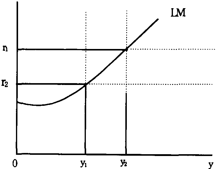 图2(c) 在货币市场中,LM曲线上的每一个点都表示货币供给等于货币需求。为了满足货币市场的均衡条件,利率水平必须同收入水平相配合。因此,LM曲线表示的是使货币供给等于货币需求的收入和利润的各种组合。一般地说,位于LM曲线右方的收入和利率的组合,都是货币需求大于货币供给的非均衡组合; 位于LM曲线左方的收入和利率的组合,都是货币需求小于货币供给的非均衡组合; 只有位于LM曲线上的收入和利率组合,才是货币需求等于货币供给的均衡组合。