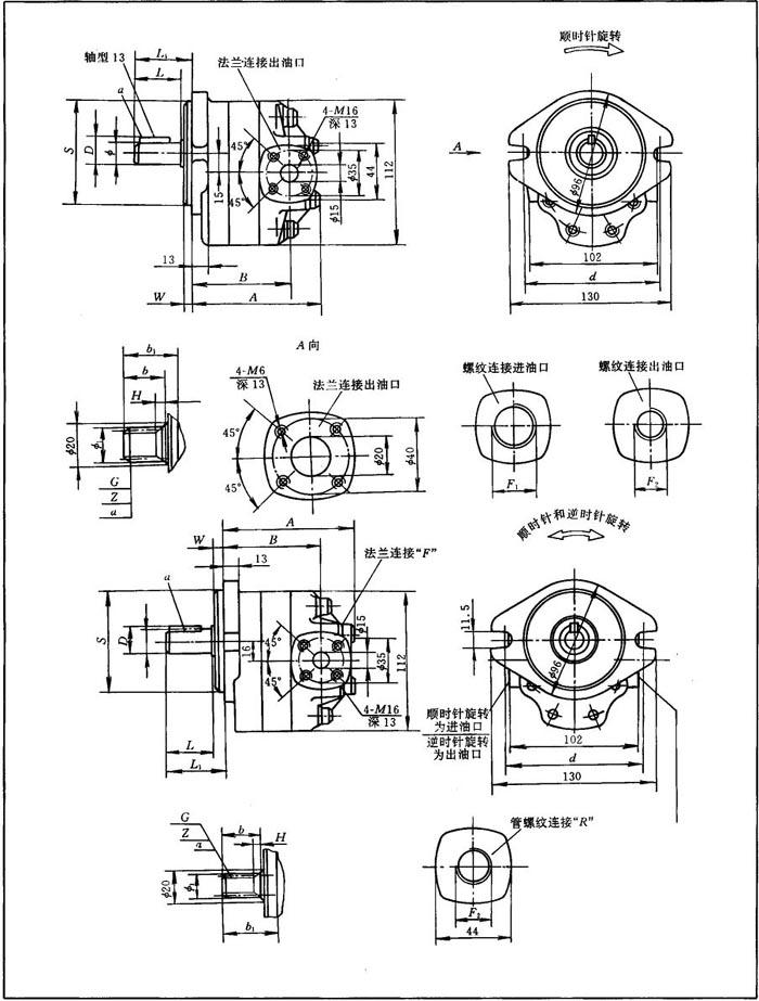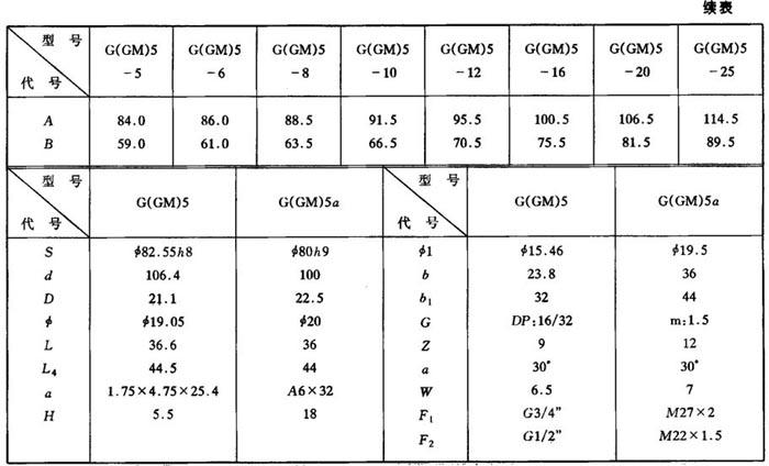 长江液压件厂和天津机械厂生产 (1)型号说明 G 5-(*)*-*(*)* * * -20-*-* * ❶ ❷ ❸ ❹ ❺ ❻ ❼ ❽ ❾ ❶ 名称:齿轮泵 ❷ 结构尺寸 ❸ 排量(mL/r):5,6,8,10,12,16,20,25,30 ❹ 安装法兰:A——SAEA型 1——GB2353.1-80“A”型 ❺ 轴伸型式 13——SAE“A”型平键圆柱Φ10.05 15——SAE“A”型渐开线花键10/32DP9齿 E13——平键圆柱Φ13 H15——渐开线花键EXT12Z×1.5m×32p× 5d GB3478.1-83 S17——平键圆锥 ❻ 进、出油口连接形式:F——法兰连接 R——管螺纹连接 S——公制螺纹连接 ❼ 设计编号 ❽ 旋转方向(从轴端看):L——左旋 R——右旋 ❾ 标准标志:CH——符合国标GB连接 省略——符合英制SAE连接 (2)性能参数 见表13.5-10及表13.5-11。 表13.5-10 G5系列齿轮泵性能参数  (3)外形及安装尺寸 见表13.5-12。 表13.5-12 G5系列齿轮泵和GM5系列齿轮马达外形及安装尺寸   |