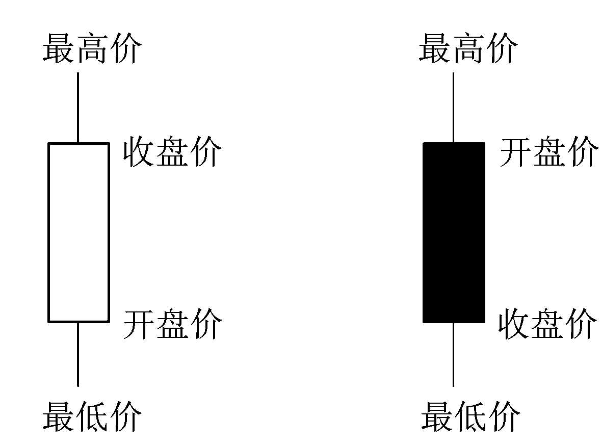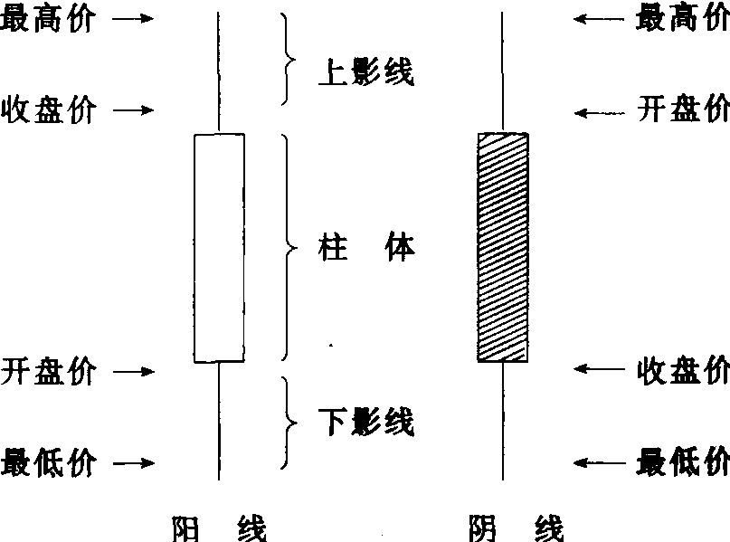 上图为基本图形,同时还有多种变形。以阳线图形为例:(1) 如果当日收盘价即为最高价,无上影线,同时当日开盘价即为最低价,亦无下影线,称为“光头光脚阳线”;(2) 如果当日最高价高于收盘价,有上影线,而当日开盘价即为最低价,无下影线,称为“带帽阳线”;(3) 如果当日收盘价即为最高价,无上影线,而当日最低价低于开盘价,有下影线,称为“带尾阳线”。阴线图形亦有类似变形情况,分别称为“光头光脚阴线”、“带帽阴线”、“带尾阴线”。再如,如果当日开盘价与收盘价相同,图形上没有长方形实体,称为“十字星”。K线图起源于日本德川幕府时代(1603—1867)的米市交易,用来反映米价每天的涨跌情况。后来人们把它引入股票市场和期货市场的价格走势分析中,并逐渐风行于东南亚地区,现已成为股市技术分析的一种重要方法。 K线图 K线图K curveK线亦称“阴阳线”或“蜡烛线”。据说起源于日本德川慕府时代,大阪米市商人用来记录市场行情的价格波动。K线的构造分为:上影线、下影线和中间柱状实体部分。其中,上影线的最高点和下影线的最低点,分别表示当天(或周、月等)行情到达的最高价和最低价,而中间柱状实体是由开盘价和收盘价联结起来的。如果收盘价较开盘价高,中间柱体以红色来表示,或是柱体留白,这种K线称为“阳线”,或称收“红盘”;反之,如果收盘价低于开盘价,中间柱体则以黑色表示,这种K线称为“阴线”或称收“黑盘”。如图10-12所示。