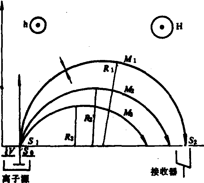 式中 R为质谱仪或光谱仪输出的28N2和29N2信号强度的比值即R=28N2/29N2。 质谱分析 将样品在质谱仪的电离室中经电子轰击所形成的离子进行电磁分离,然后根据绝缘极上接收到的离子流强度,计算15N丰度,如图1所示。不同质量的N2分子在电离室受到阴极发射的电子的轰击,电离产生相应的离子。在电离室的出口缝(S1)和离子源的出口缝(S0)之间有一个加速电场。带有相同电荷而质量分别为M1,M2和M3的正离子受到电场和右上方磁场的作用,作圆周运动。圆周运动的半径为离子质量、电场电压、磁感应强度的函数: