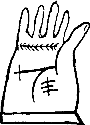 2. palm of the hand,lines on the palm of the hand手掌,(相术语言)掌纹。