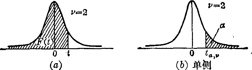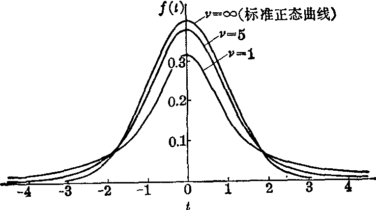 图1 不同自由度时的t分布曲线 图1说明,当v增大时,t分布逐渐逼近标准正态分布。t分布的分布函数为
