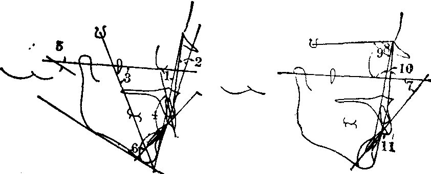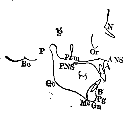 图1 常用的测量标志点 S.蝶鞍中心点,N.鼻根点,Or.眶点,ANS.前鼻棘,PNS.后鼻棘,P.耳点,A.上牙槽座点,B.下牙槽座点,Pg.颏前点,Me.颏下点,Gn.颏顶点,Ptm.翼上颌裂,Bo.Bolton点,Go.下颌角点。 常用平面 ❶眼耳平面:眶点与耳点的连线所成的平面。 ❷Bolton平面:这条线是从鼻根点至Bolton点的连线,左右两条线成一个平面。该平面之上为颅部,平面之下为面部。 ❸面平面:通过鼻根点与颏前点的连线的平面。 ❹下颌平面:通过下颌角下缘与颏下点的连线的平面。 ❺前颅底平面:通过蝶鞍中心点与鼻根点的连线的平面。 ❻颌平面: 通过第一恒磨牙或第二乳磨牙的牙尖高度中点与中切牙覆颌中点的连线的平面。 ❼Y轴:蝶鞍中心点与颏顶点之连线。 常用测量角 ❶面角: 面平面与眼耳平面相交之下后角,此角代表颏部的突度。 ❷颌凸角: 为鼻根点-上牙槽座点连线与颏前点-上牙槽座点连线延长线之交角,此角代表上颌凸度。 ❸Y轴角: Y轴与眼耳平面相交之下前角,代表生长发育的方向及颏部的位置。 ❹上、下中切牙角:上下中切长轴之交角,表示上、下牙弓之突度。 ❺下颌平面角: 为下颌平面与眼耳平面之交角,可以显示下颌体的陡度及下颌角的大小。 ❻下中切牙-下颌平面角:下中切牙长轴与下颌平面之交角,代表下中切牙对下颌平面的倾斜度。 ❼下中切牙-眼耳平面角:下中切牙长轴与眼耳平面之交角。代表下中切牙对下颌平面的倾斜度。 ❽蝶鞍中心点-鼻根点-上牙槽座角: 代表上颌对颅部的相对凸度。 ❾蝶鞍中心点-鼻根点-下牙槽座角: 代表下颌对颅部的相对凸度。 ❿上牙槽座-鼻根点-下牙槽座角: 代表上下颌的相互关系。(11)上中切牙凸距: 上中切牙切缘至上牙槽座点-颏前点连线的垂直距离,此距代表上中切牙的凸度(图2)。