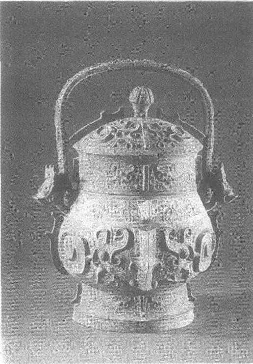 西周。通高36厘米,口径14.8——11.6厘米,腹深20厘米。重6.5公斤。1971年陕西省泾阳高家堡出土。陕西省博物馆藏。卣,古代酒器,用以盛酒。此卣体呈椭圆形,鼓腹。盖有瓜棱形钮,提梁两端作龙首形,盖顶及腹部为张口卷唇的巨首身尾卷曲夔龙。盖沿和圈足亦饰夔龙器口下饰双身共首夔纹。自盖至足,有四道扉棱。盖内铸有铭文“作父戊彝戈”四行七字,记载为父戊铸造祭器。器内底有“”铭。与同时出土的卷体夔纹铜尊铭文相同。铜卣与铜尊成组。尊、卣饰卷体夔纹,殊为罕见。
