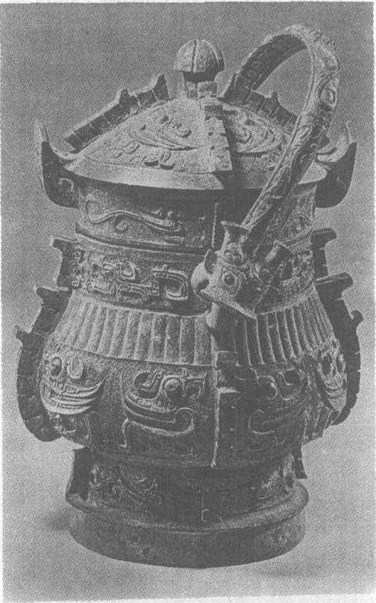 商。盛酒器。通高27厘米,口纵9厘米,口横10.4厘米,腹纵13.8厘米,腹横15.8厘米,腹深11.3厘米。重3.15公斤。1965年河南省辉县褚邱出土。新乡市博物馆藏。此卣体呈椭圆形,鼓腹,圈足较高,提梁置于器身正面。盖钮呈半球形,上饰六个三角蝉纹。盖顶有四条扉棱,扉棱之间各饰一凤鸟。盖两侧各出一扉首,上饰蝉纹。盖沿饰四鸟纹。提梁剖面呈半圆状,外侧饰四夔纹,内侧饰带状环纹,两端各有一兽首。夔身有四扉棱,与盖上扉棱相对应。颈饰夔纹,腹饰凤鸟纹,圈足饰鸟纹。夔盖内和腹内底有铭文:“且辛”二字。从此器的形制和纹饰看,属于商代晚期器物。卣形似壶,但有提梁,故习称提梁卣。