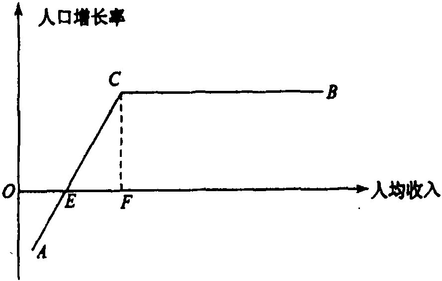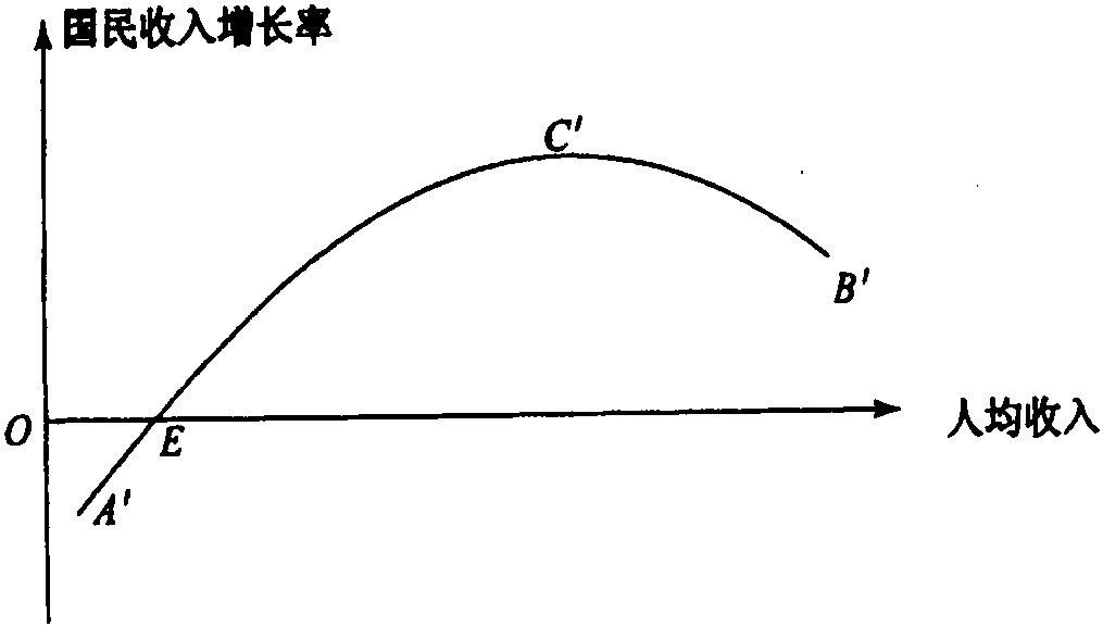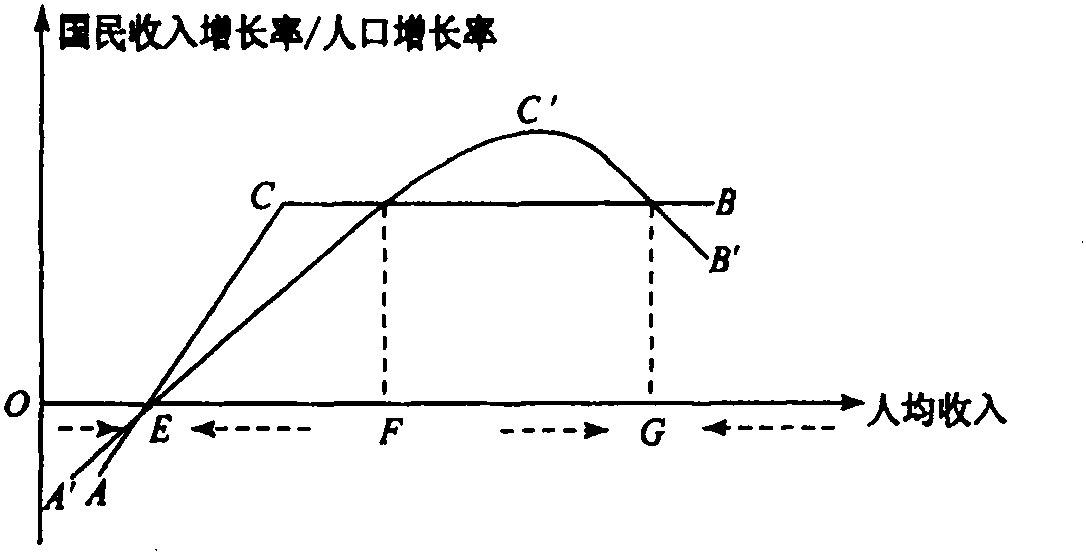 图1 人口增长率与人均收入变动的关系 图中的ACB曲线表明了人口增长率随人均收入增加而变化的过程。当人均收入水平小于OE时,人口增长率为负值。随着人均收入的提高,人口增长率也上升。当人均收入达到OF以后,人口增长率不再上升。 一国的经济增长率与收入水平之间也存在着依存关系。在经济发展的一定阶段,人均收入水平的增加将导致资本的增加,促进经济增长率的提高。但当人均收入达到较高水平以后,新增加的收入将主要用于消费,投资的份额相对减少,使经济增长率下降。这一关系可用图2来加以说明。 图中的A′B′C′曲线表明了国民收入增长率随人均收入增加而变化的过程。当人均收入水平小于OE时,国民收入增长率为负值。当人均收入达到OE时,人口处于静止状态,国民收入增长率为0。在E点以后,人口和资本都在增加,国民收入随之增长。在C′处,国民收入增长率达到最高水平。此后,国民收入还会增长,但增长率降低。 把图1和图2合在一起,就可以比较清楚地看到经济增长率、人口增长率与人均收入变动三者之间的关系(图3)。当人均收入低于OE时,国民收入增长率高于人口增长率,使人均收入提高。但当人均收入超过OE、低于OF时,人口比国民收入增长得更快,使人均收入降低,又回到OE附近。在较低的人均收入水平上,一旦国民收入的增长快于人口的增长,人均收入水平开始提高,生活改善,就会使人口增长率提高。这样一来,刚刚增加的收入就会被多出来的人口瓜分殆尽,使人均收入回到原来的水平。只有通过大规模投资,才能迅速提高人均收入,进入国民收入增长快于人口增长的阶段。E点是一个低水平均衡点,它就像一个陷阱,发展中国家很难从其中脱身。G点也是一个均衡点,不过是高水平的均衡。如果能够越过F点,就可以比较顺利地实现高水平均衡。结论是:发展中国家要摆脱低水平均衡陷阱,经济发展初期必须做出 “临界最小努力”,即投资应足以使国民收入的增长超过人口的增长,从而使人均收入水平大幅度提高。