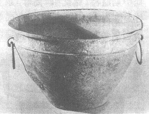 西周。通高25.5厘米,口径39.2厘米,腹深25厘米。重7.6公斤。1976年陕西省扶风县庄白村窖藏出土。陕西省周原文物管理所藏此器大口斜沿,束颈,深腹,小平底。肩部两侧有小钮衔环耳一对。通体光素无纹。器内壁铸有铭文四字。记载作器,时代为西周懿、孝时期。其形制特殊,在商周青铜器中属首次发现,用途不明,可能为水器。