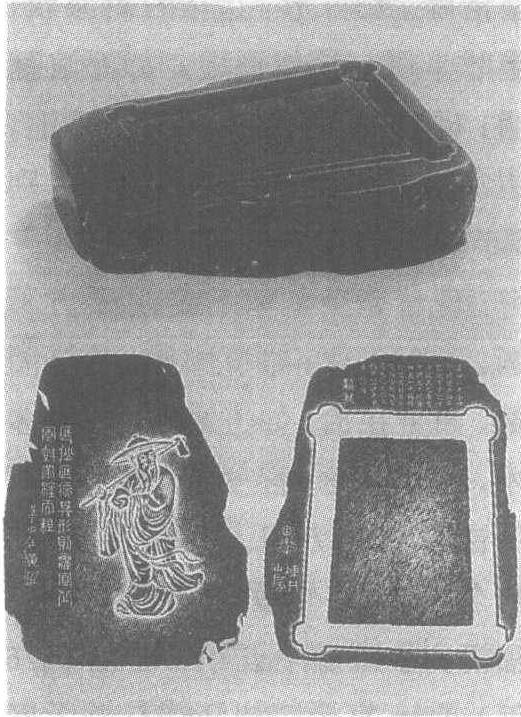 清。长22.3厘米,宽18.3厘米,高5.5厘米。天津市艺术博物馆藏。广东肇庆端石,石质精坚,温润细腻;色苍黑。砚随石形,“井”字形砚堂,四周环水,石面内含有黑色纹点,如细雨丝丝,故名“墨雨”。砚面上端刻有周绍龙小楷题款“莘田二丈令四会时,搜三洞石制砚不下数十方,拔其尤者有十,号为十砚翁,此其一也。镌形于阴,书铭其右,有取乎砚畊之意,后之览者犹可想其丰采云。”以及阳文<绍> <龙>两方印;旁刻“目学”和“伡井山房”记述黄任在高要县任知县时搜集古砚的情况。周绍龙,字允乾,号瑞峰,福建闽侯人,雍正间进士,善书。黄任,字莘田,福建长泰人,富藏砚,工诗善书,雍正二年(公元1724年)任广东四会县知县,著有《秋江集》。