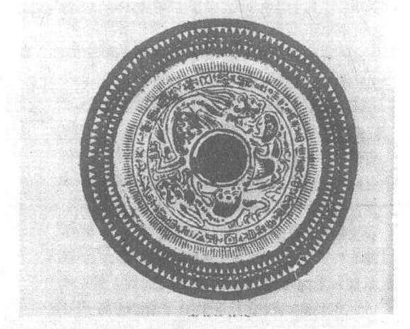 东汉。直径12.5厘米。1963年江西省清江洋湖出土。江西省清江县博物馆藏。铜镜圆形,体厚实,镜面微鼓,背面中央有圆形素钮,钮外浮雕有鼍龙涌浪花纹,外有两道凸弦纹,其间铸有一周汉隶铭文:“青盖作竟四夷服,多贺国家人民息,胡虏殄灭天下服,风雨时节五谷熟,长保二。”外区略高起,上饰有锯齿纹、曲折纹、凸弦纹。
