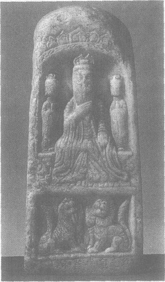 北周保定元年(公元561年)。高26.7厘米,宽11.6厘米。北京中国历史博物馆藏。造像正面龛内中间雕一头戴道冠、须髯拂胸、身着宽袖大袍的老者,其右手捋须,左手扶膝,盘腿坐于台座上。身后左右各立一侍童,座下刻相对蹲坐、表情怪异的两只猛狮。背面上方龛内刻三个袖手踏莲花并排而立的道人,下刻“保定元年四月三日道民马洛子皂西玉先君像一区上为七世父母所生父母依缘眷属一□□道口”。两个侧面上方龛内均雕袖手坐莲花座上静思的道者。下方刻人物及题字“道民马洛子一心”和“子妻陈阿俗”。
