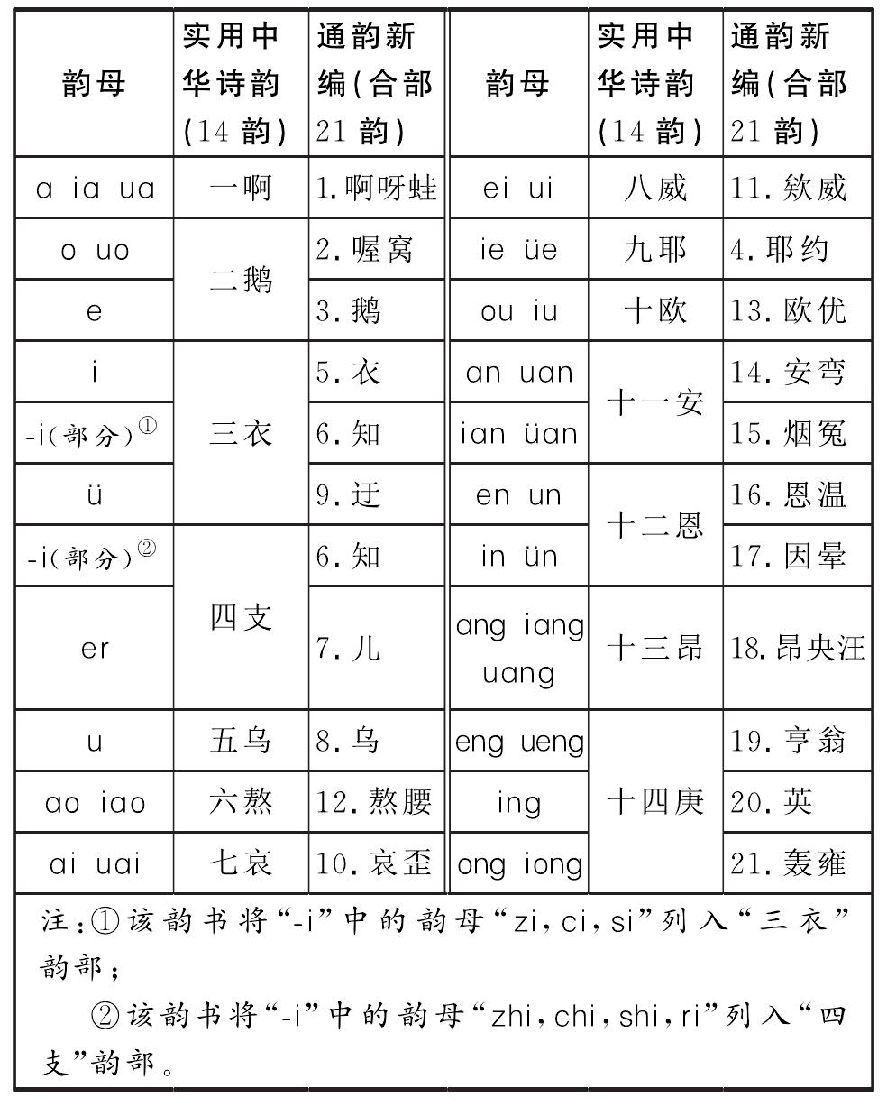 | 释义 | 《实用中华诗韵》与《通韵新编(合部21韵)》比较 《实用中华诗韵》与《通韵新编(合部21韵)》比较2005年吉林人民出版社出版的《实用中华诗韵》(秋风主编),采用“一类分部法”,根据《汉语拼音方案》将全部韵母划分为14个韵部。《实用中华诗韵》与《通韵新编(合部21韵)》的比较如表所示。 《实用中华诗韵》与《通韵新编(合部21韵)》比较表