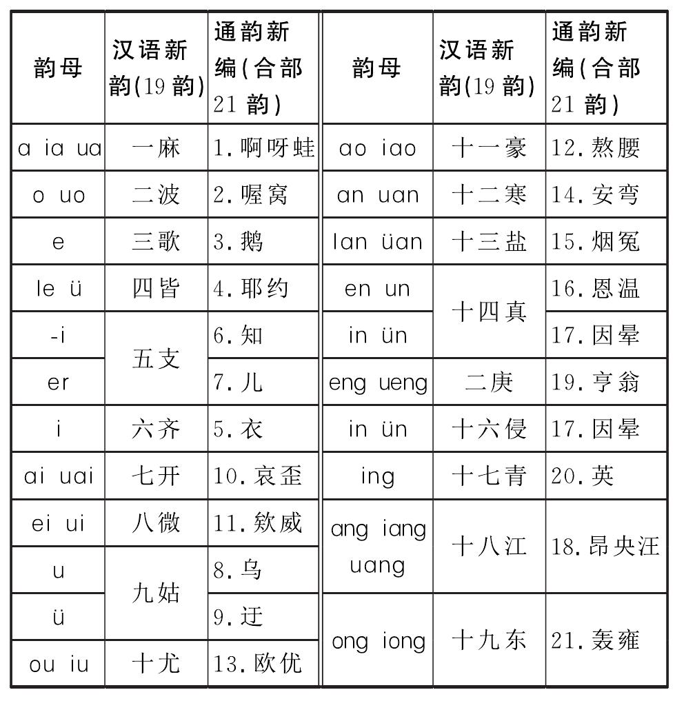 2017年华中师范大学出版社出版的《汉语新韵》(程宝庆编著),采用“一类分部法”,根据《汉语拼音方案》将全部韵母划分为19个韵部。《汉语新韵》与《通韵新编(合部21韵)》的比较如表所示。