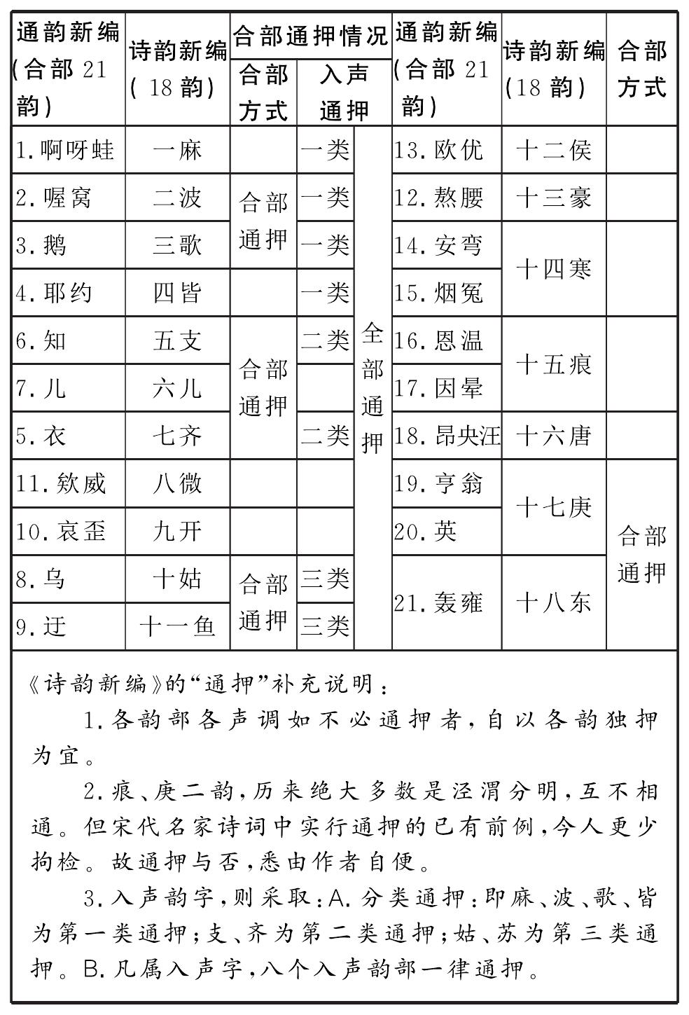 | 释义 | 《诗韵新编》与《通韵新编(合部21韵)》比较 《诗韵新编》与《通韵新编(合部21韵)》比较由上海古籍出版社编撰的《诗韵新编》是当前诗坛使用比较普遍的韵书,其实质是1941年由国语推行委员会颁布的十八韵《中华新韵》的简编。1957年中华书局出版的《汉语诗韵》(王惠三编著)和2004年汉语大词典出版社出版的《中华新诗韵》(谢德馨编著),它们的韵部划分与十八韵《中华新韵》相同。《诗韵新编》的特点:一是采用汉语拼音注音,并根据汉语拼音的韵母划分韵部;二是允许通押,体现为“两类分部法”,根据该韵书的分韵与合部情况,可称之为“13部18韵”;三是将入声单列,专门设定“仄声·入声”部分,“旧四声”中的入声字,也许有些在“新四声”中已经是平声了,但仍规定作为仄声使用。《通韵新编(合部21韵)》依据《汉语拼音方案》来划分韵部,旧读入声字全部依据新的读音划入相应的韵部,但在技术上采用了两点措施:一是正文部分,对旧读入声字下加一圆点“·”,以表明该字旧读入声;二是对于含旧读入声字的诸韵,将这些旧读入声字汇总,作为附录列在对应诸韵之后。基于上述两点技术措施,让《通韵新编(合部21韵)》完全可以兼容《诗韵新编》,进而方便习惯使用《诗韵新编》的读者。同时,本着“分韵从严”的原则,《通韵新编(合部21韵)》较之18韵《诗韵新编》多了3韵,即将后者的“十四寒”“十五痕”“十七庚”三个韵部,各自又细分为两韵,且允许通押,进而为读者用韵提供了宽严不同的两种选择方案。《诗韵新编》与《通韵新编(合部21韵)》的比较如表所示。 《诗韵新编》与《通韵新编(合部21韵)》比较表