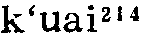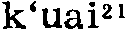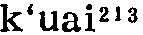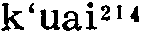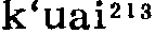 㧟读音k·uai(ˇ),为uai韵目,属ai—uai韵部。枯怀切,平,皆韵。 ❶用胳膊挎着。如:㧟着菜篮子。 ❷轻抓;搔;㧟痒。 上一条: 蒯 下一条: 擓 㧟kuǎi❶舀,用勺子盛:~上一勺芥末面,兑点香油格外香。(汪玢玲 李少卿《长春市民俗方言志》) ❷用臂挎着:~着篮子去买菜。(汪玢玲 李少卿《长春市民俗方言志》) ❸走:有车不坐架步~,你这是为啥呢?(《难忘岁月》) 㧟kuǎi❶舀。〔例〕那里头,红枣、莲子、白木耳熬好了,撒上白糖,早拿凉水镇着,这会儿吃起来,又甜、又凉、又腻乎,德子一勺一勺㧟着吃,咂摸着生活的甜蜜。(中86.2.104)∣小耗子,上缸沿,拿小瓢,𢶒(㧟)白面;烙白饼,卷瓜菜;不吃不吃吃两筷。(歌一18.5)∣这准是哪个伙计㧟酱时,㧟得太满了,撒在地上一摊。(天173) ❷臂上挎。〔例〕龙蛋子胳臂上㧟着一只柳篮子,柳篮子里有酒肉供品和三炷高香。(十89.1.133) ❸挠。〔例〕“不但扇扇子有规矩,就拿叫蚊子叮一下,你㧟㧟痒痒也有规矩。”“那有什么规矩呢?”“蚊子要是叮在脸上,必得往下㧟,蚊子要叮在腿上,必得往上㧟。”(全三580)∣说着,小火儿就把手伸进后脖领,去㧟痒痒儿。(庚二386) ❹前后脚倒腾。〔例〕敲开院门,一个老太太㧟着“三寸金莲”走出来。(酒360) 㧟k‘ uɛi53❶挎,持,穿: ~着篮子,~着一双皮鞋。 ❷拉闲话: ~闲着呢。《唐韵》: “古准切,揩摩也,又抆拭也。” 或以为拉闲扯磨当为脍。 㧟擓ㄎㄨㄞˇkuǎi三3283①动舀。⑴东北官话。辽宁锦州〖 〗。~汤。于宪涛《吃狗》:「赵二嫂歇晌转回家,~盆凉水放地下。」⑵北京官话。北京〖 〗。~一勺儿白面。⑶冀鲁官话。山东利津〖 〗。饭本来就不多,让他一下子~了一大碗去。②动用指甲抓;搔。⑴东北官话。东北〖 〗。一到夏天他就起痱子,后背都让他~破了‖~痒痒儿。内蒙巴林左旗。⑵北京官话。北京〖 〗。这儿痒痒,给我~~。⑶冀鲁官话。天津〖 〗。猴儿总~痒痒。山东淄博、桓台〖 〗、莒南〖 〗、寿光〖 〗。⑷中原官话。山东郯城〖 〗。他把腿~破了。山东梁山〖 〗。给我~~痒痒。山东枣庄〖 〗、东平〖 〗、平邑〖 〗。江苏徐州〖 〗。⑸胶辽官话。山东烟台〖 〗。用手~~痒儿。山东牟平。1936年《牟平县志》:「爪搔曰挠又曰~。」辽宁大连〖 〗。把我后背~一~。⑹江淮官话。江苏淮阴〖 〗。~破皮了。③动挎;挽;提。⑴东北官话。东北〖 〗。~着小竹篮。⑵北京官话。北京〖 〗。手里~个篮子。⑶中原官话。山东梁山〖 〗。河南〖 〗。张九来《姑嫂观灯》:「她们两个人~着胳膊并着肩。」⑷胶辽官话。山东平度〖 〗。~篓子。⑸江淮官话。江苏镇江〖 〗。篮子里东西多,~不动。⑹徽语。安徽绩溪〖 〗。佢他~着只猪耳朵,把猪放到猪栏子。④动有福气。东北官话。东北〖 〗。林和平《搞对象》:「哪个小伙子要是娶上秀云这个姑娘当媳妇呀,那他就~了!」⑤动步行。北京官话。北京〖 〗。没车就~着。⑥动把「将(帅)」移离中线(象棋用语)。北京官话。北京〖 〗。~老将‖把它~出来。⑦动穿(戏谑语)。北京官话。北京〖 〗。天一冷,他就把毛衣~上了。⑧动受;对付。中原官话。江苏徐州〖 〗。连生三个孩子,真够她~的。⑨动佩戴。湘语。湖南长沙〖 〗。~符号。⑩动背。湘语。湖南长沙〖 〗。~书包。湖南吉首〖 〗。⑪动带着;装着。湘语。湖南长沙〖 〗。口袋里~哒五块钱。⑫动撇。北京官话。北京〖 〗。这人走道儿两脚朝外~。⑬名器物的提手。徽语。安徽绩溪〖 〗。水桶~‖㧟篓~。   㧟擓kuǎi〈口〉 ❶用指甲挠 △ ~痒痒。 ❷挎着 △ ~着篮子去买菜。 ❸舀 △ ~一瓢水。 㧟擓(方) ❶用指甲轻抓;搔:~痒痒。 ❷挎:~着篮子。 㧟刲kuāi❶搔痒,用指甲挠。如:爷爷有个“老头乐”,哪儿一痒痒,自己拿过来就~~,从不求人儿。 ❷挎。如;老太太~着篮子去集市买菜。 ❸舀。如:他打开一个烟壶,用挖勺~出点儿烟末儿来放在拇指上,按入鼻孔,狠吸了吸。 ❹穿。如:天一冷,他就把毛衣~上了。 ❺撇。如:这人走道儿俩脚朝外~。 ❻步行。如:没车就~着走。/八十里~了一整天。 ❼象棋用语,把“将,帅”移离中线。如:~老将。/把它~出来。 㧟擓kuaiFE63 〈方〉❶用胳膊挎着:她右手~着个篮子。 ❷搔;用手指甲抓:~痒痒。 㧟(擓)kuǎi [方] ❶ (用指甲抓; 搔) scratch: ~ 痒痒 scratch an itch ❷ (用胳膊挎着) carry on the arm: ~ 着小竹篮 with a small bamboo basket on one's arm |