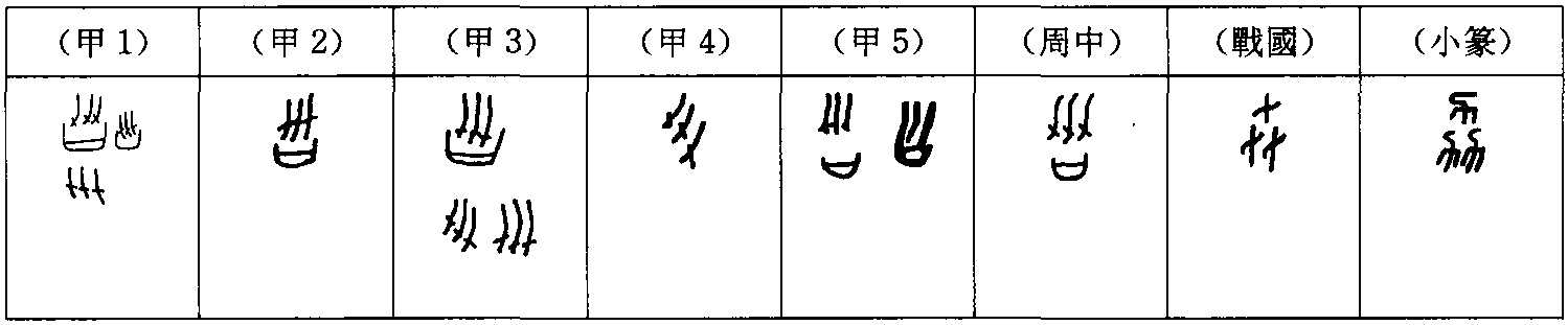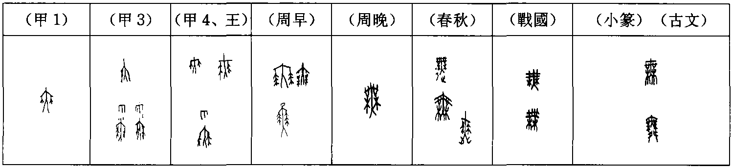 有時字的大小也會影響字形的選擇。如文(字1),早期的字形有作一人的胸上有交叉或心形的刻紋狀,另一形則省略胸上的刻紋。刺紋是古代喪葬時的美化儀式,所以銅器銘文多用作稱呼已過世的人,如前文人、文祖、文妣、文父、文母,故創意必是在胸上刻紋。如把刺紋省略,創意就不清楚。我們發現,甲骨卜辭的字小時,文就不寫刺紋的部分, 字大時就不省略, 如 《合》4611作交叉紋 ( ), 《合》18682作心紋 ( )。 因此可知, 空間容許時較會書寫較完整的字形, 字太小時只得省略某部分的字形。時代較晚的文件,可能因其使用的性質,有採用較之當代或前代一般的字形更為原始或寫實的習慣。再舉一個現在還常見的現象,現代一般所用的書體是楷書,但是圖章所用的書體卻常是秦漢時代的小篆。因此,文獻的年代不是判定字形演變方向的絕對標準,但文獻的性質是不能忽略的輔助標準。 書寫者的身份也是值得注意的,官方的文件往往較民間的保守而正確。官方公佈的文字,有充裕的時間書寫,而且意在展示,故一般較為謹慎,不隨意變動。民間的文化水平較低,同時為求快捷以應付增加的工作量,就喜歡省減筆劃,而且也比較不會因文字的潦草而受到處罰。由於他們的文化水平較低,所簡省的也往往是不當的部分,六朝的碑刻文字錯誤多,石工識字水平應是重要的因素。相對的,同時代的文字,簡帛或竹簡上的文字形體多有不同,一個字往往有二至四種形體。而銅器上的便顯得較單一,改變的程度比較小。銅器銘文較多官方的製作,簡帛文字則多私人的書寫,這也說明官方的文件書寫較謹慎,故有些學者就把金文視為正體,甲骨為俗體。正體就是在比較鄭重的場合使用的正體字,俗體就是日常使用的比較簡便的字體。 字形的演變有時也有地域性的習慣,如皇字(字195)為裝飾有孔雀羽毛的帽子形象 ( ), 到了春秋時代, 羽毛末稍豎劃各增一短橫, 戰國時代的曾侯乙鐘還保存羽毛的眼 ( ), 但楚系文字就把眼的部分省去了 ( )。 從創意的觀點看, 也應是較遲的字形。 同樣表現了曾、楚地域之異的例子,還有曾姬無卹壺的室字,其形符仍作屋形 ( ), 而楚系銅器及簡帛則常只保留屋脊的部分, 如客 ( 鑄客鼎)、室 ( 鑄客豆)、 寶 ( 欒書缶)。 楚地可能因進入中原的政治舞台較晚,使用漢字的時機較窄,水平也有差距,故常有省略的習慣,這也再次印證不能單據年代作為判定字形演變的方向,一定還要配合字的創意、字形演變規律、文獻性質等條件,才會得到較可靠的論定。(三)字的創意 就一般文字的演變方向看,為了整齊與美觀,繁雜的字形要簡省,簡易的字形就要增繁,使字的結構有適度的筆劃。譬如第五節所談的形聲字,其演化的過程,經常是為與假借或引申義分別而加上一個意符或聲符,其中可能也隱含有使筆劃適度的用意。又如全由聲符組成的形聲字,戰國時代假借為宮調的羽字加上于的聲符,假借為語詞的乎字加上虎聲,本字的筆劃都不多,也可能就是為了此原因,而不是聲讀起了變化,需要重新標上適當的聲符。 但有時兩個字形的筆劃相差不大,文獻的性質相近,年代也相若,就應另找演變趨向的條件,而字的創意也應是有效的參考條件之一。如果某字創意絕對重要的部分被省略了,就較可能是因後世不明創字的用意而簡省。如微(字265),甲骨文作一手持利器打殺病弱長髮老人之狀,而楚簡就有省去手持利器的部分。失去必要的棒擊動作,當然是變化後的字形。又如秦字(字309)作雙手持杵舂打兩束禾以製精米之狀( )。 如省去雙手 ( ), 也就失去必要的舂穀動作, 就是較遲的字形。 向下舂打的動作應持棍棒的上端, 則雙手下移的寫法 ( )也應是較遲的變化。灋(字25)的創意是如羊似鹿的廌獸,有判斷善惡的本事,而法律要求公正如水之保持平衡。廌是構成法字的絕對必要部分,省簡成水與去兩個構件組合的字形,就無法創造去除罪犯者的法律概念,所以被省去廌的字形,自是較遲的字形。如果一形的創意較合理,自也可以看作較早的字形,如望字(字144)象人豎起眼睛遠望之意。遠望以站在高地 ( )效果較平地好, 故站在平地 ( )的較可能是後來簡省的字形。創意必要部分被省掉了的字形,其時代比較晚,要解決有這種條件的字形演變方向比較容易。如果省略的部分並非是必要的,就比較難於判斷兩個字形之間到底是增加或減省的關係。雖然一般的情況是繁複的要求簡省,簡易的要求增繁,但有時字形已相當繁雜了,卻有人仍然覺得尚不夠達意而想加以補足,以下略舉數例: 秋(字50),甲骨文第一期作一隻蝗蟲之形。因它出現於夏秋之際,商代秋季包括夏季,故其意義,除蝗蟲外還代表秋季。第三期除此形外,多作一蝗蟲之下有火形,至第五期兩形並存。目前戰國的文獻作从禾从火或从日从秋。 《說文》的小篆作从禾从火, 籀文作从禾从 。如果從年代與字形的條件看,其最可能演變的過程是,先有蝗蟲之形,然後下加火,再加禾,然後省蝗蟲形,或省蝗蟲形而加日。但從創意的觀點看,蝗蟲的形狀易與其他昆蟲相混,故籀文的字形蝗蟲部分就錯成龜。但表現農民以火驅趕的景象,可能更易表現蝗蟲的種屬以及出現的季節,因而有火的字形有可能是較早的字形。