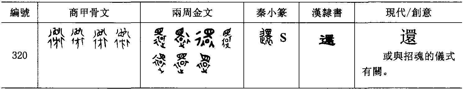 還字(字320)【 ,復也。从辵,瞏聲】,甲骨字形的創意不詳,也許與以衣服或在行道招魂的儀式有關,原作行道之中有眉及方,另一形作行道之旁有衣與目。西周金文,第二形的衣中增一圓圈以表示頭部(或以為是聲符),但到了戰國楚簡,很多含有環字部件的字又恢復無圓圈的字形。小篆再恢復有圓圈的字形。