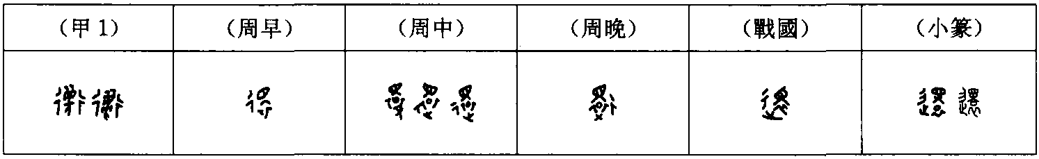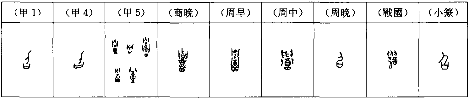 魯字(字237)作盤上美味的魚料理形 ( ), 盤子的□形錯成曰( ),訛變的字形自是較合理的字形為晚。 再如,舞字(字146)甲骨第一期作一正視之人兩手下垂持舞具跳舞之狀 ( )。 到了第四期或在所謂的王族卜辭中, 就有不少兩臂作平舉的 ( ), 這是不自然的姿態,是不明創意者依樣畫形所造成的錯誤,應是較遲之形,此形演變到春秋與戰國時代則發生減省人形的訛變。第四期與所謂的王族卜辭有同樣的錯誤,也指出其為同時代風氣的資訊。在一般的情況下,以寫實的程度作為判定字形演變方向的根據,要比單以年代條件更為可靠。(六)造字法: 形聲字較其象形、象意字的結構為晚的時代性 形聲字本是文字因引申或假借等應用,為別義而加上意符或標明音讀而增繁的過程中自然形成的。它讓字形易於規劃、分類及音讀,不但有意以此種新形式創造新字,也以便利的形聲字結構替代原有的象形、表意字,很少有反其道而行的。第五章討論形聲字舉了不少,如誥字(字214)本作雙手持長管樂器 ( )。 長管樂器是政府作公衆宣告的方式,其習慣或已改變,或為了標音,就改為形聲。這樣的例子甚多,虹字(字213)原作雙頭虹形 ( ),猴字(字210)為猴子的象形 ( ), 囿字(字45)為特定範圍内栽植草木的場所 ( ), 遲字(字230)作背負一人行走而致遲慢 ( ), 沈字(字209)為沈牛於河中之狀 ( ), 耤字(字199)本作一人以手持犁, 一足踏犁耕地之狀的表意字 ( ), 後加昔聲而成形聲字。 齒(字202)本也是純象形字 ( ), 後來標上止聲。寶(字289)本作屋中藏有貝、玉等貴重物品 ( ), 缶聲也是後加的形聲字。有時一字有筆劃相近的異形,如果其中一形屬形聲字,就可能是較晚之形。 如赦字(字331) 【 , 置也。 从攴, 赤聲。 , 赦或从亦】,西周金文由亦與攴構成,表現一手持杖撲打一大人而致流血之狀。不知是因字形訛變,還是以形聲取代,說文作从攴,赤聲,也是形聲的結構較象意結構晚的例子。