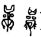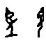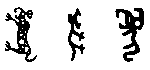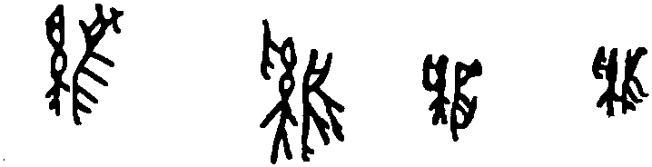 (五)寫實的程度 寫實的圖畫比較容易被簡化為抽象或變形的筆劃,很少有逆行的例子。六千多年前仰韶文化陶器上的魚紋彩繪,慢慢由寫實變成幾何形的紋飾,就是好例子。銅器上的圖案也有相同的趨勢,商代的饕餮紋還可以看出動物眼眉口鼻等形狀和正確的位置,到了西周就逐步簡化,終成交纏的幾何形圖案,難看出動物的形象。又如南方印紋陶的蛇紋本是越族的信仰圖騰,其蛇形與斑點也簡化和演變成幾何紋。要把抽象的筆劃文字還原為具體的圖象,如果沒有同類詞句的比較,常是很困難的。如《合》33041與33042都有一個方國名,一版寫得相當的抽象,另一版則頗像一隻金龜子的形象( )。 其前應該是更為寫實的形象, 很可能就是 《三代》 16.47b銅角上的族徽( )。 有了具象的圖形, 其省簡的過程就容易了解。中國漢字從象形的特徵演變到今日的符號特徵就是一個很好的例子。 寅(字70)本借箭形為干支 ( ), 第五期在箭身加方框( ),至西周中期就完全變形 ( )。 比較 “具體的形象描寫”和 “不成形的筆劃”之間的遲早,無疑具象形的要較原始。如上所述,學者主張年代較晚的銅器銘文上的字形,尤其是族徽文字,一般要較商代的甲骨文字形早,就是因為其上描寫的物體形象具體些。這個原則還可以應用到文字的部分構件。譬如人的眼睛,看起來近鼻子的一端較寬,故早期的字形,眼睛的構件,就寫成一邊寬一邊細,如甲骨文作 ,後來小篆寫成同寬度的 。 朢初作 或 , 小篆作同寬度的 , 眼睛都失去寫實的意味, 自是較遲的字形。 又如動物的形象,畫出身子或腳爪的,自也比身子畫成一線或沒有腳爪的要早。虎(字18)就是一個很好的例子 ( )。 甲骨文的尋字(字294)作伸張兩臂以丈量一物之長度狀。第一期時,被丈量的器物有長管樂器的言( )、席子的㐁 ( )、不知名器等構件 ( ), 第二期以後出現所丈量的東西成為一豎劃的新字形 ( ), 可能從作言之旁一豎劃而雙手丈量之字形演變而來 ( )。 雖然伸張兩手以丈量長度的創意尚可意會,畢竟不若丈量實物的表意清楚,故從寫實的原則看,應是較遲之形。旁字(字148)作有犁壁之耕犁形,作用是把翻起的土推向兩旁。犁壁是塊寬板 ( ), 作矩形的要較工形的寫實 ( ), 就可判斷作矩形的要較工形的早。類似的變化也在帝字(字72)表現出來,花瓣或草紮神像的形象中的矩形方框 ( )也變成工形 ( )。