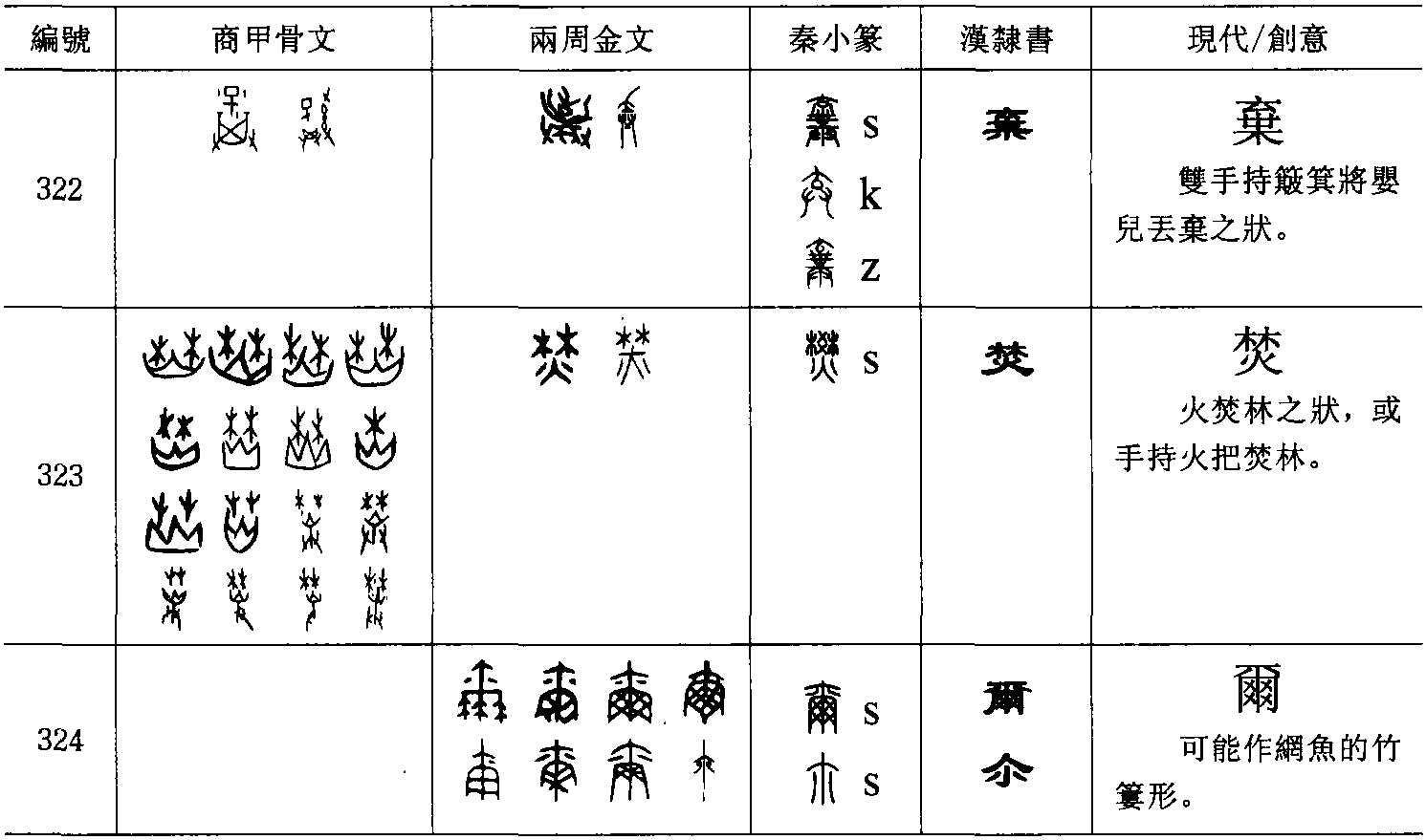 甲骨文的毓字(字31),一般作一婦女(有時簡成人形)生下一個帶有血水的嬰兒狀, 第一期就出現 ( )。 另一形則加手持衣袍以便包裹新生的嬰兒狀 ( ), 到第五期才出現。 一來此字形已太繁複, 二來前一字形已充分表現生產的意義,故此晚出的字形就被淘汰了。有人建議,可能基於較進步的醫學觀念,後來才知用衣物包裹新生嬰兒以防受寒生病,故手持衣袍的毓字是較遲的結構。在文字的使用時期,穿衣已是正常的習慣,嬰孩一出生應該就會加以包裹,不會是後來才有的新知識,故不必是晚出的寫法。今以簡形較早出現,且已足以表達生育之意,故定為較有衣袍的一形為早。召字(字225),甲骨文也有簡、繁二形,簡形出現於第一期及第四期, 作一杓與一杯 ( ) (或以為是旨字), 繁形見於第五期及銅器。最繁複的作一手持杓一手拿杯,自盛於溫酒盆中的酒壺挹出酒漿以待客之意 ( )。 或簡省酒尊 ( )、溫酒器與酒尊 ( ), 或省酒尊與杯( )。 從創意看, 晚期的字形較合理, 較易明白待客的創意。 很可能早期的一杓及一杯是旨字,表示湯羹旨美之意。簡易的字形除作為地名外,第一期還作為動詞,為用牲之法。繁形的都作地名,也沒有證據可看出兩個不同的寫法都同指一地,即兩個寫法是同一個字。如果從創意的觀點看,第五期的繁複字形較合理,應較接近創字的初形。一杓及一杯實在不太容易表達旨美或招待的意義。不管此字是由簡而繁或由繁而簡,在使用的過程中,都出現反復或使用較早字形的現象。焚字(字323) 【 , 燒田也。 从火林】第一期作火焚林或焚草之狀,第三期作單手或雙手持火把焚燒森林之狀。雖然在乾燥季節可能因打雷而造成森林大火,但在古代,較常見的焚林景象是人為的,如焚燒山林以獵取野生動物或種植農作物,因此手持火把焚林的景象較常見,較具象。雖然目前根據甲骨文的資訊,手持火把的字形年代較晚,但從創意的觀點,有可能反而是較早的字形。
