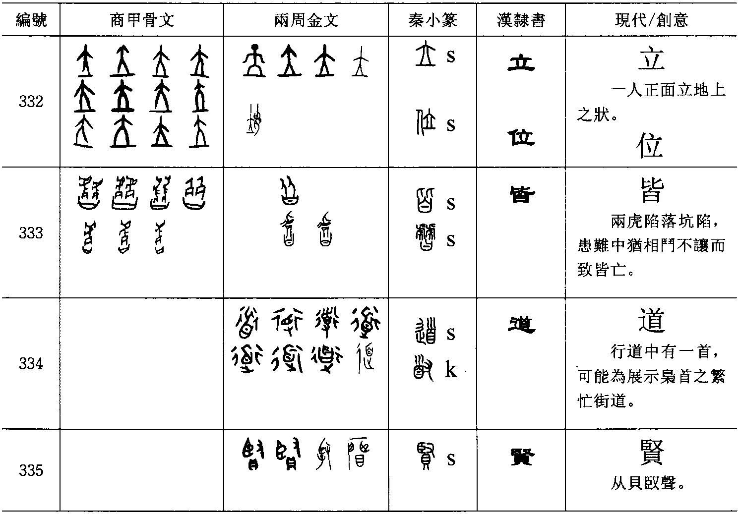 一般情況下,異體字形以形聲的形式較遲。如有反向的情形,必有其特殊的原因。《說文》立部的竵字【 ,不正也。从立,聲】,因為所从的聲,意義為【 ,秦名土鬴曰。 从鬲, 午聲。 讀若過】, 罕見使用, 一般人不識其音讀,不明其意義,故才別創以不正會意的歪字,筆劃也減少許多。歪字如是取常見的聲符,就不會有這種反常。形聲字較象形或表意字早出現的例外還有一例, 小篆位字【 , 列中庭之左右謂之位。 从人立】以人所立之處為其位置會意,早期金文借一人正面立於地上之立字(字332)【 ,侸也。 从大在一之上。 凡立之屬皆从立】表示。 戰國時代銅器中山王壺的銘文出現从立胃聲的形聲字。位置是經常會被使用的字義,十四筆劃太繁,可能就創只七筆劃的从人立會意的位字。窺 【 , 小視也。 从穴,規聲】字為形聲字的結構, 六朝的碑刻墓志常寫作穴下視、宀下視、門内視等字形,有以為是以從穴或門内向外窺視會意。六朝時人常寫錯字,視字較窺常見,有可能本為錯字,後來誤以錯字的宀下視為有意創造的會意字,又再度誤為門内視。總之,這種會意字取代形聲字的例子是異常的現象。(七)部件更替 部件更替是學者常提及的現象。一個字可能因某種原因,更換某一構件 (包括構思與結構)而形成異體字,有時是因不同材料的製作,或使用於不同的用途,或來自不同的性別,或字的音讀起了變化等等。通常構形較合理的時代較早, 如毓字(字31), 作女人生子狀 ( )就要比作側人形生子狀要正確 ( )。 另外, 字形較簡易的, 其時代也往往較遲。 如皆字(字333)【 ,俱辭也。 从比从白】 【 ,兩虎爭聲。 从虤从曰。讀若憖】甲骨文作已朽成白骨的兩虎在坑陷中之狀,表達老虎的習性,雖患難之中猶相鬥不讓步而至皆亡。省作一虎者已有損創意,故為後起的省形。金文作兩人在坑陷中,已不符原意。大致人的筆劃較虎簡單是導致皆字異寫的一個因素。道字(字334)【 ,所行道也。 从辵首。 一達謂之道。 , 古文道从首寸】,西周金文原作行道中有一首,表達作為展示梟首之繁忙街道。 戰國文字就有改有髮之首為無髮之𦣻者, 省了些筆劃。 但同時又增加一手以持首,或部件更替 (彳止辵)而多一止。