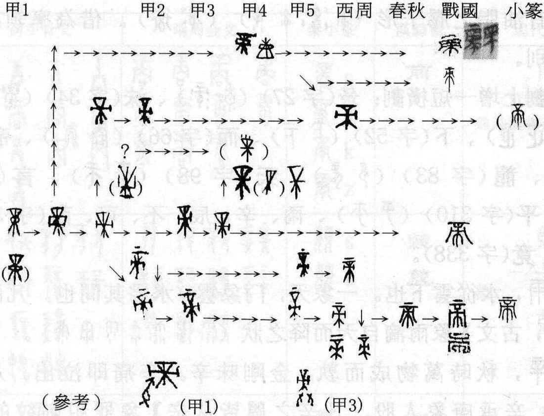 蛛字(字201)的形聲字形作从黽朱聲 ( ), 小篆或从虫 ( )。虫的筆劃也比黽少得多。 又如鑪(字204), 本是象形字 ( ), 先是加上虎的聲符 ( ), 後來因為鍊金而構築, 故从金 ( )。 有的因它是生火的器物,也不一定用來鍊金,就从火。古代大部分的爐子以陶土構造,故有从缶的罏。從目前的資料看,可能站立式的燒火爐流行較晚,早期鑪子多以煉金為目的,所以從金的鑪字出現最早。小篆收有籀文罏字 ( ), 但無爐字。 爐字見於漢代的銅爐, 現在也以爐字最常見, 其代換的構件,呈現時代越晚筆劃越少的現象。但有時是因著重點不同而使用不同意符,或為了別異而選用另一個筆劃較繁的聲符,因非基於有意的簡省, 就難據以判定演變的方向。 如賢(字335) 【 , 多財也。 从貝,臤聲】本為从貝的形聲字,表達多財之人,也引申為多才、盛德的人,故別造从子臤聲之字以別義。它雖筆劃少,義類也較合理,但不被接受,最後還是選擇賢字。書寫過程中偶發的錯誤,有時也被舉以為字形演變的例子。甲骨由於順應刀法的便利,有先刻直線再刻橫劃的習慣,以致刻完直劃後忘了刻橫劃。這就不應該視為簡省,除非同樣現象的例子很多,或是後代的字形由之再演變,否則不宜冒然作為簡省的常例。有時在其他種類的文獻也有漏寫直劃或橫劃的例子,如常被舉例的 《呂氏春秋·察傳》: “子夏之晉,過衛,有讀史記曰: 晉師三豕涉河。子夏曰: 非也,是己亥也。夫己與三相近,豕與亥相似。”己亥兩字缺刻直劃便成三豕,它畢竟不是這二字的演變常態。因此不要舉之以為字形演變的例子。甲骨文由於是用刀刻在光滑、堅硬的卜骨上,所刻的字又不大,有時刀子會滑入另一道筆劃的溝中而不覺,並不是有意書寫的字形,也不宜舉以為例,如 《合》33694上的伊字,一作正常的形態( ),一則手持的筆杆與人的軀幹合用一豎 ( )。 這樣的字形不但在甲骨非常罕見,也沒有演變成後世的字形,只能算是某個人的一時筆誤。《英》 996上有四條“乎舞,亡雨?”的刻辭,舞字都作舞具套在手臂之形 ( ), 而不像其他超過一百個的例子作下垂在手臂下。如不是偽刻,就是習刻。像這些筆誤,都不應視為字形演變常規的例子去研究。以下試以帝字(字72)為例,示範探討字形演變的較完整步驟。 (1)《說文》說解 ,諦也。 王天下之號。 从二束聲 。 , 古文帝。 古文諸丄字皆从一,篆文皆从二。二,古文上字。(2)字形排列 (依時代)