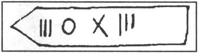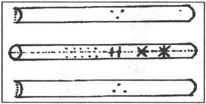 图2—8 傈僳族木刻上的符号 云南红河哈尼族所用的一根典当土地的木契,其上刻着一些符号,以 “*”表百元,“×”表五十元,“|”表十元,“·”表一元。另外,契之两侧各刻三个圆点,以示双方中证人三人。(见图2—9)[17]