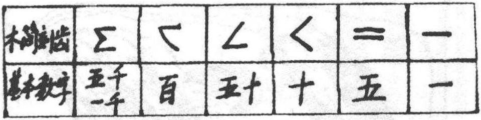 图2—9 哈尼族典当土地的木契 西藏的僜人有自己的语言,属汉藏语系藏缅语族,无文字,以刻木、结绳、摆木棍或树枝记事。比如僜人借债时就是在板壁上刻道记数。其他实物记事的方式还有用不同的事物代表不同的事情,这也是在现代无文字的许多民族中能见到的方式,比如黔东南的苗族用黄豆的数量来记录劳动的工分数,一粒黄豆代表一个工分。 以上案例和文献的记载表明,契刻符号虽然还不是文字,但曾经发挥过帮助记忆、传递某种信息、作契约凭证等记事作用,但正如郭沫若所说,这些符号是原始汉字的一个源头,古人利用这种形式,把一些数字符号或象形符号刻画在陶器或竹木片上,用以传递某种信息,由此就有可能逐渐演化成类似青铜器上的族徽文或是竹简木牍这类的文书,文字和文献也就逐渐地形成了。由此可以认为,契刻比结绳和其他方式的文字起源 (如八卦等)传说都更具促进文字产生的条件。 事实上,汉字中的许多文字,其最早的字源,应该就是刻画符号。地下出土的秦汉简牍表明,先秦和秦汉的简牍时代里,社会上曾实行过一种刻齿计数的方法,随着纸张取代简牍,这套计数的方法便失传了。1996年日本学者籾山明 《刻齿简牍初探——汉简形态论》(载日本 《木简研究》第十七号)一文,发现了刻齿符号与所示的数字之间的对应规律,使以往看似没有差别的刻齿成了可以释读的数码,特定的木简刻齿表示特定的基本数字,其对应关系 (如图2—10) :