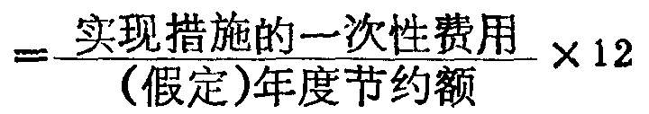 | 释义 | 一次性措施费用亦称“技术组织措施费用”。为采用技术组织措施而一次支出、以后不再重复支出的费用。例如,为采取某项改进技术的措施所需购置设备的费用,研究试验的费用等。为了预测和考核这项费用支出的经济效益,可计算技术组织措施费用的回收期,它表示采用措施后,以获得的节约额抵偿一次性费用所需的期限。回收期越短,表示措施的经济效益越高。回收期通常以月为单位,其计算公式如下: |