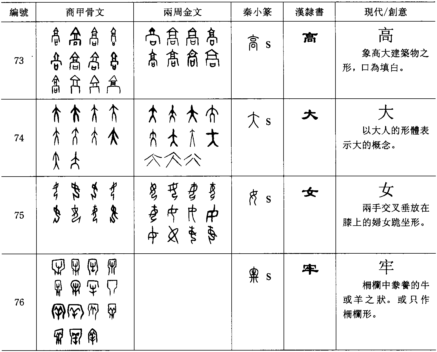 石(字101)【 , 山石也。在厂之下。 口象形。凡石之屬皆从石】,以有尖銳棱角的石塊表意,為使意義更清楚,加坑陷之形明示石塊挖土之功能。尿(字102)【 ,人小便也。从尾水】、屎【 ,糞也。从艸,胃省聲】, 【《廣韻》𦳊, 《說文》曰糞也。 本亦作矢, 俗作屎】, 象一人排泄尿與屎之狀。人的排泄物無獨特的形狀,若不加上人所排出該物的部位,不但兩者的指稱難明,也易於與其他小東西混淆。胃(字103)【 ,穀府也。 从肉鹵。 象形】, 消化食物的胃的形狀加上肉或腸子形,以免與其他形狀類似之物形混淆。㳄(字104)【 ,慕欲口液也。从欠水。凡㳄之屬皆从㳄。 ,㳄或从侃。 , 籀文㳄】, 口水和其他液體難於分別, 加上一人張口而流出之狀,明示其物質所出之處。果(字105)【 , 木實也。 從木, 象果形在木之上】, 加上樹木的形象,才易明白是果子的形象。如前所言,這一類複體的象形字不妨也可視為下一類的表意字。一般的區別是使用為名詞者為象形,使用為其他詞類者為表意。為省事起見,大可以把非形聲字都視為表意的一類,以與形聲的一類分別。象形字一般是名詞,但較晚的時代可能被用以代表其他類別的意義。如: 高(字73),象一高大建築物之形,口為後來無意義之填空。使用時大多引申為高低或遠近的意義,雖然商代以來的文獻不見使用以為高大的建築物之義, 但之前的時代有可能使用以表達高大的建築物 ( ![]() ![]() )。克(字106)【 ,肩也。 象屋下刻木之形。 凡克之屬皆从克。 古文克。 ,亦古文克】,從皮字(字107)【 ,剝取獸革者謂之皮。从又。 凡皮之屬皆从皮。 , 古文皮。 , 籀文皮】作手持皮製的盾牌狀,推知克字是描寫皮盾的形狀。但它並不用以表示盾牌,而是表達能夠用以防身的能力。來(字108)【 , 周所受瑞麥來麰也。 二麥一夆, 象其芒朿之形。天所來也,故為行來之來。詩曰,詒我來麰。凡來之屬皆从來】,本是來麥的全株形狀,可能因它是外來的品種,使用時大多引申 (或有可能經由假借)為往來的意義。享(字109) 【 , 獻也。 从高省。 曰象孰物形。 經曰, 祭則鬼亯之。 凡亯之屬皆从亯。 ,篆文亯】,象在夯土臺基上的建築物形, 因是享祭鬼神的所在,故用以為動詞而不用為臺基上的高大建築物之義。