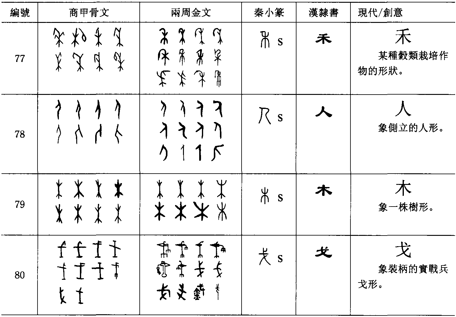 又如,歸類的標準偏重字義時,因有些物象的形體並沒有非常獨特的輪廓,需要輔助的訊息以確定其指稱。有人就因其使用的意義是名詞性的,就歸類於象形。但有人因其字形為複體,就不認為是象形字了。如酒(字8), 甲骨文作一酒尊及濺出的三酒滴形 ( ![]() ![]() )。 有人就因象形文字為獨體的原則,以及有假酉為酒的例子,認為酒是以酒壺所裝的液體表意,或認為是从水酉聲的形聲字,並不認為是象形。又如牢(字76)【 , 閑也。 養牛馬圈也。 从牛冬省, 取其四周匝】, 甲骨文一般作一牛或一羊關在柵欄中之狀,但也有只作柵欄形的。牢在卜辭中是種特意豢養於牢中、不放任四處遊蕩的祭祀犧牲。表示的是特殊的品物,非一般的牛羊。尤其是牢中的動物換成馬時,意義才是飼養家畜的牢廄,故或以為其本義為牢固或特殊處理的祭祀犧牲,應屬表意而非象形。但它也有只作柵欄形的寫法,故以為本義是柵欄,後來才引申為特意圈養的牛、羊牲品。又如上文已介紹過的秋(字50),以秋季出現的蝗災表達其季節。蝗蟲的形象是象形,但秋季的意義卻是表意。就字形看,它是獨體的象形字。但從意義表達的手法看,應是獨體的表意字。不管是簡單的,還是較詳細的分類,都不免有難以確定界限的字,所以不必定要分出某個字的造字法是象形或表意,只要能和以表聲為訴求的形聲字分別就可以了。最重要的還是了解一個字的創意以及其使用的意義。以下暫依字的結構形式,略述常見的象形字類型,約可分為三類: A. 單體的形式,較少有爭議。約可分為二類: (a)寫一個器物的整體形狀,如: 象(字16),畫整隻象的形狀。 最重要是把長鼻子表現出來 ( ![]() ![]() )。馬(字18),畫整隻馬的形狀。腳可以是單筆或複筆。馬鬃是必要的形象 ( ![]() ![]() )。羽(字29)【 ,鳥長毛也。象形。凡羽之屬皆从羽】,畫一枝羽毛形。不嚴格要求羽紋對稱(![]() ![]() )。禾(字77) 【 ,嘉穀也。以二月始生,八月而孰,得之中和,故謂之禾。从木,象其穗。凡禾之屬皆从禾】,畫一株穀類作物的形狀。根葉可以對稱或不對稱,最重要是表現頂端下垂的穗,否則就成木字。人(字78)【 , 天地之性冣貴者也。 象臂脛之形。 凡人之屬皆从人】,象側立的人形。金文族徽記號以人構形的常把頭部也畫出來( 、 ),但一般的就把頭與身子連成一線 ( ), 比較不正確的就把頭與手臂連成一線 ( )。木(字79) 【 , 冒也。 冒地而生, 東方之行。 从中, 下象其根。凡木之屬皆从木】,象一株樹的形狀。樹枝可以是對稱或不對稱的。戈(字80)【 , 平頭戟也。 从弋, 一衡之。 象形。 凡戈之屬皆从戈】,畫一把裝柄的兵戈形。戈內一端的裝飾絲穗也常被畫出來。或因為是以銅鑄造,就加上意符金,使形式成為形聲字。