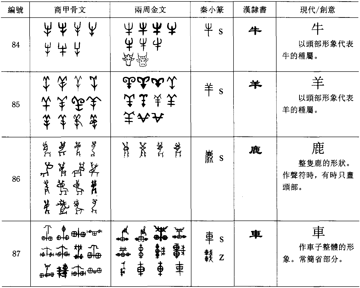 虎(字17),是整隻老虎的描寫,但作聲符時,就只畫其極具特徵的頭部 ( )。 作意符時也經常只畫頭部 (![]() ![]() )。馬(字18), 本作馬整體的形象, 戰國時有作只剩頭部的 ( ), 因為馬的頭形特殊。牛(字84)【 , 事也。 理也。 像角頭三, 封尾之形也。 凡牛之屬皆从牛】,描寫牛頭的形象以代表牛的種屬,包括雙角與兩隻眼睛,特徵是上翹的兩角。其為牛的頭部而非全身的形象,可從金文族徽記號得知。羊(字85)【 , 祥也。 从, 象四足尾之形。 孔子曰, 牛羊之字以形舉也。凡羊之屬皆从羊】,描寫羊頭的形象以代表羊的種屬,包括角與眼睛,特徵是下彎的兩角。鹿(字86)【 , 鹿獸也。 象頭角四足之形。 鳥鹿足相比, 从比。凡鹿之屬皆从鹿】,是鹿全形的描寫,但作聲符時,有時只畫有歧角的頭部, 如甲骨文麓字或作林中一鹿頭 ( )。車(字87)【 ,輿輪之總名也。 夏后時奚仲所造。 象形。 凡車之屬皆从車。 , 籀文車】, 本作車子整體的形象, 後來因形象太繁複,把輿、輈、衡等部分省略,最後只留一輪及轄釘之形,古代有輪子的器物只有車,故不妨害對它的認識。
