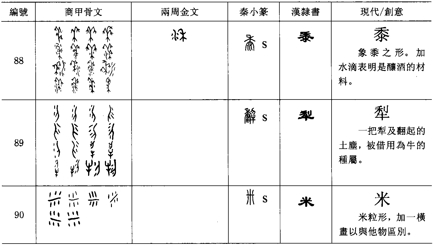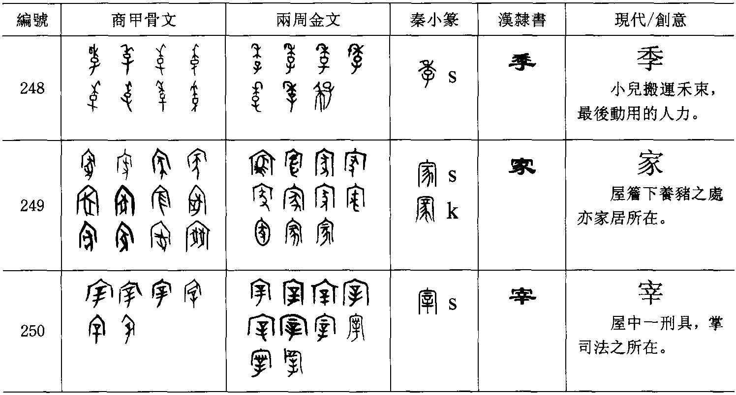 䝭(字245), 甲骨文常作為量詞使用, 為兩塊修整後的肩胛骨包成一束之狀。 寫成䝭只是為了方便, 與句聲無關。 同樣意義的句子有時寫作屯。 屯為兩版肩胛骨包成一束的側面形象,䝭則為下視的形象。 稷(字246) 【 , 齊也。 五穀之長。 从禾畟聲。 , 古文稷】【 , 治稼畟畟進也。 从田儿从夂。 詩曰, 畟畟良耜】可能以跪坐祈禱於禾神之前表意,初義為農官,後來才用以名禾之種屬。畟可能自稷字析出 (畟ts‘iək, 稷tsjiək)。年(字247) 【 , 穀熟也。 从禾, 千聲。 春秋傳曰, 大有年】表現一成年男子頭上頂着收穫的禾束狀,古代一年一熟,引申指一年的時間。年不是禾類,人與禾連接在一起不分開,較不會是形聲字 (人njien,年nen)。季(字248)【 , 少稱也。 从子稚省, 稚亦聲】, 小兒搬運收穫的禾束,天气突變時最後動用的人力,與子或稚聲無關 (子tsjieev,稚dier,季kjiwer)。