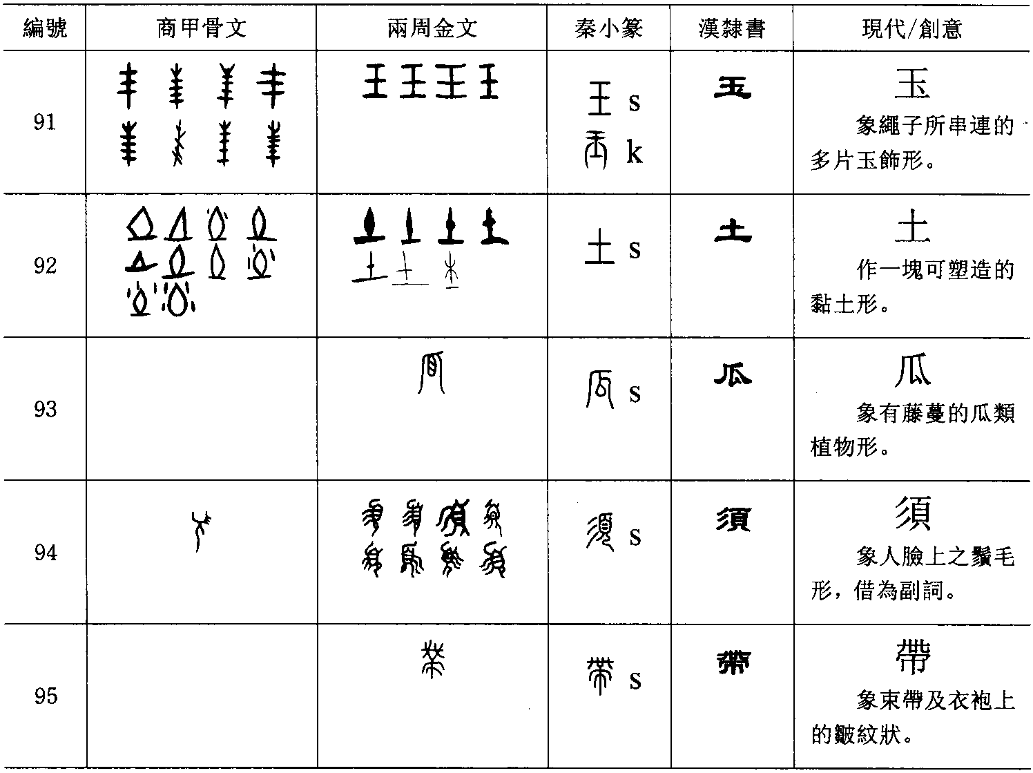 米(字90) 【 , 粟實也。 象禾黍之形。 凡米之屬皆从米】, 指更精製的小米或稻米粒,如只畫小米點,就容易與他種物體相混,故加無特定意義的一道橫畫。玉(字91)【 , 石之美有五德者。 潤澤以溫, 仁之方也。 理自外可以知中,義之方也。其聲舒揚,專以遠聞,智之方也。不撓而折,勇之方也。銳廉而不忮,絜之方也。象三玉之連,| 其貫也。凡玉之屬皆从玉。 , 古文玉】, 象一根繩子所串聯的多片玉飾形, 玉飾無一定的形狀,玉片的輪廓也易與他物混淆,故以串聯的玉佩飾形象去表達其質材。土(字92)【 , 地之吐生萬物者也。 二象地之上地之中。| 物出形也。凡土之屬皆从土】,作一塊可塑造的黏土形,字形很簡單,易於和他物混淆,就加上水滴的符號。加了水的黏土是製陶的材料,陶器是生活的重要器具,故以黏土造形。韭【 ,韭菜也。一種而久生者也。此與耑同意。凡韭之屬皆从韭】,作生長於地上叢立的韭菜形。有可能與其他字混淆,加上代表土地的一橫,清楚表現了其生長於地上的形象。