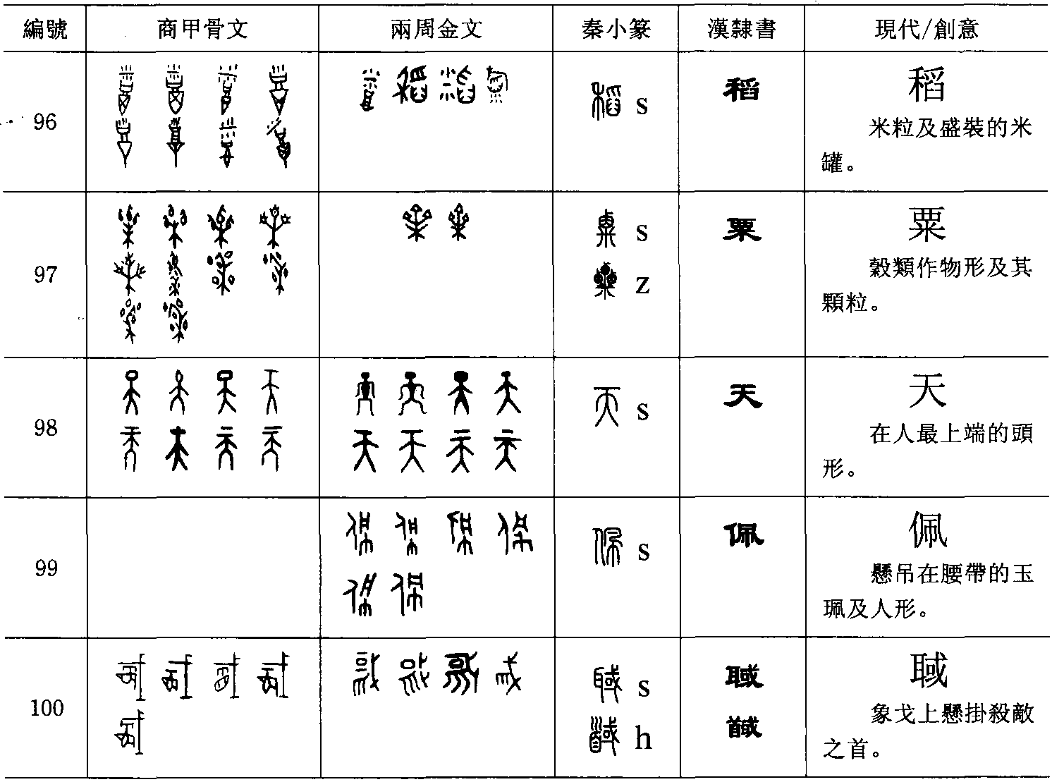 稻(字96) 【 ,稌也。 从禾舀聲】, 稻米為南方的物產, 華北一般只見其輸入的顆粒而不見其株莖形。但米粒的輪廓與很多事物相近,故加運輸時用的長形米罐。此米罐與酒尊的酉雖同為裝物之器,但形狀稍異,也不會被誤會為別的事物。米罐部分的覃本身有具體的寫法和意義。粟(字97)【 , 嘉穀實也。 从𠧪从米。 孔子曰, 粟之為言續也。 ,籀文粟】, 指黍稻一類栽培植物的顆粒。 如果只畫幾個顆粒, 也易與其他東西混淆,故加上一禾,以表明是可食用的穀粒。天(字98) 【 , 顛也。 至高無上。 从一大】, 指稱人的頭頂。 如只畫頭輪廓的一個圓圈,也易與它物混淆,故加一大人之形於其下以明確意義。佩(字99)【 , 大帶佩也。 从人凡巾。 佩必有巾, 故从巾。 巾謂之飾】,懸吊在腰帶上的玉佩,加上側立人形,表明是人所服戴之物。馘(字100)【 , 軍戰斷耳也。 春秋傳曰, 以為俘聝。 从耳或聲。 , 聝或从首】, 戰爭時斬下敵人之首, 常懸掛戈上用以展示, 故加戈以明所指。