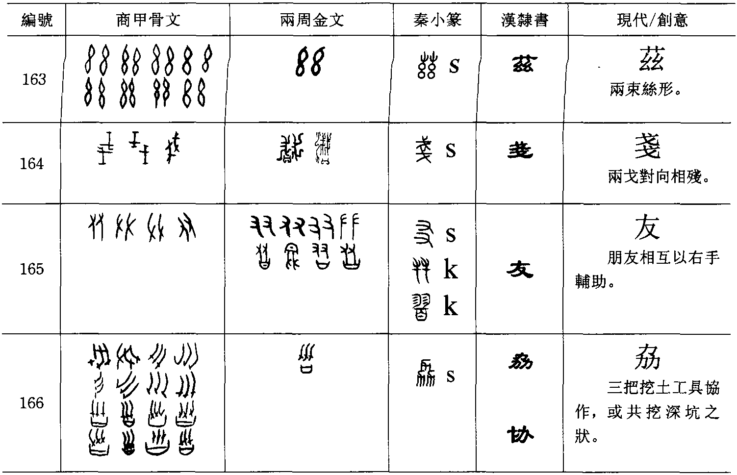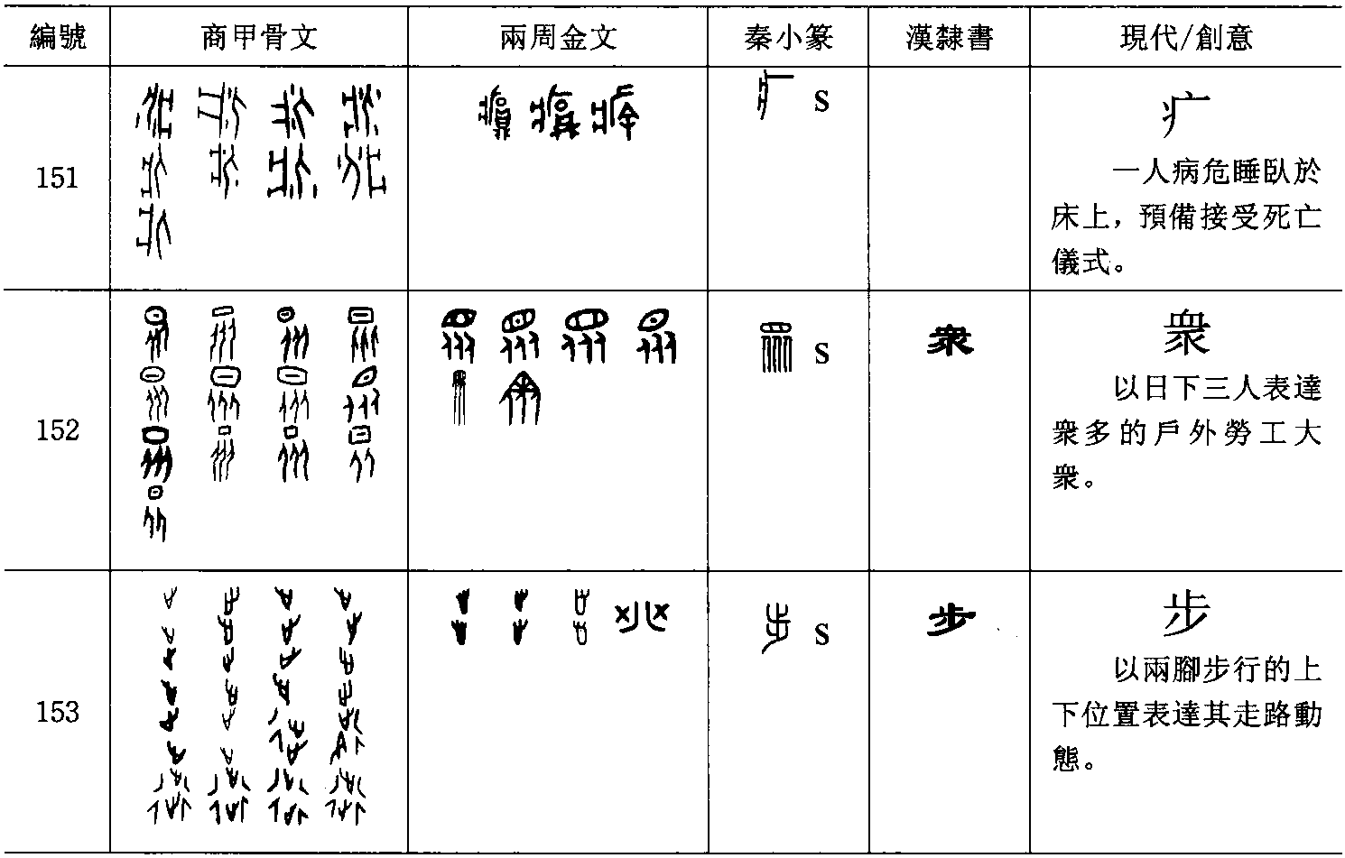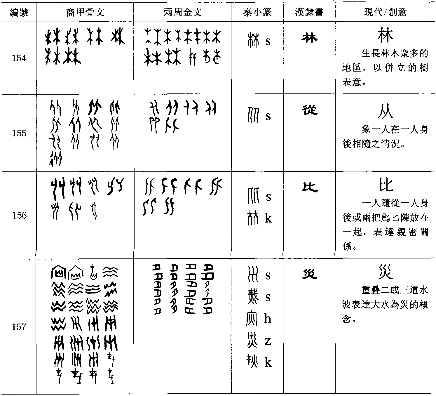 興(字149)【 ,興也。 从舁同, 同, 同力也】, 四手共舉起一輿架。輿架不成字。疾(字150)【 ,病也。 从疒,矢聲。 ,籀文疾。 ,古文】,人為箭所傷之病痛。疒(字151)【 ,倚也,人有疾痛也。 象倚箸之形。 凡疒之屬皆从疒。】,人病危臥於床上,預備接受合於禮儀的死亡儀式。衆(字152)【 ,多也。 从众目示意】, 以日下三人表達衆多的勞工大衆。步(字153)【 ,行也。 从止相背。 凡步之屬皆从步】, 以兩腳步行走的一前一後位置表達其走路動態。炙【 ,炙肉也。 从肉在火上。 凡炙之屬皆从炙】,表現肉在火上燒烤之狀。E. 兩個或更多的重複形體 林(字154)【 ,平土有叢木曰林。 从二木。 凡林之屬皆从林】,指生長林木衆多的地區,以並立的樹木表意。从(字155)【 ,相聽也。 从二人。 凡从之屬皆从从】, 一人在一人身後相隨之情況。比(字156)【 ,密也。二人為从,反从為比。 ,古文比】, 甲骨文从比不分。以一人隨從於一人之後表示其親密關係,或以兩把匙匕陳放在一起表達緊密關係。