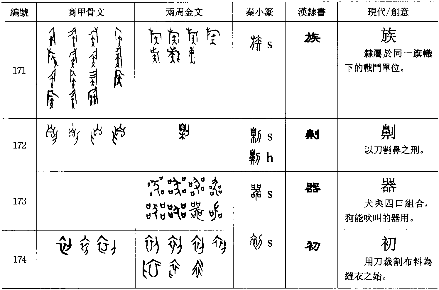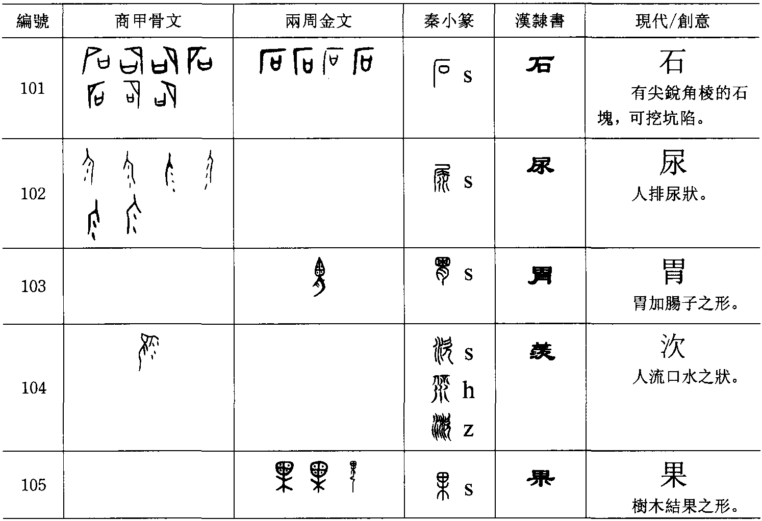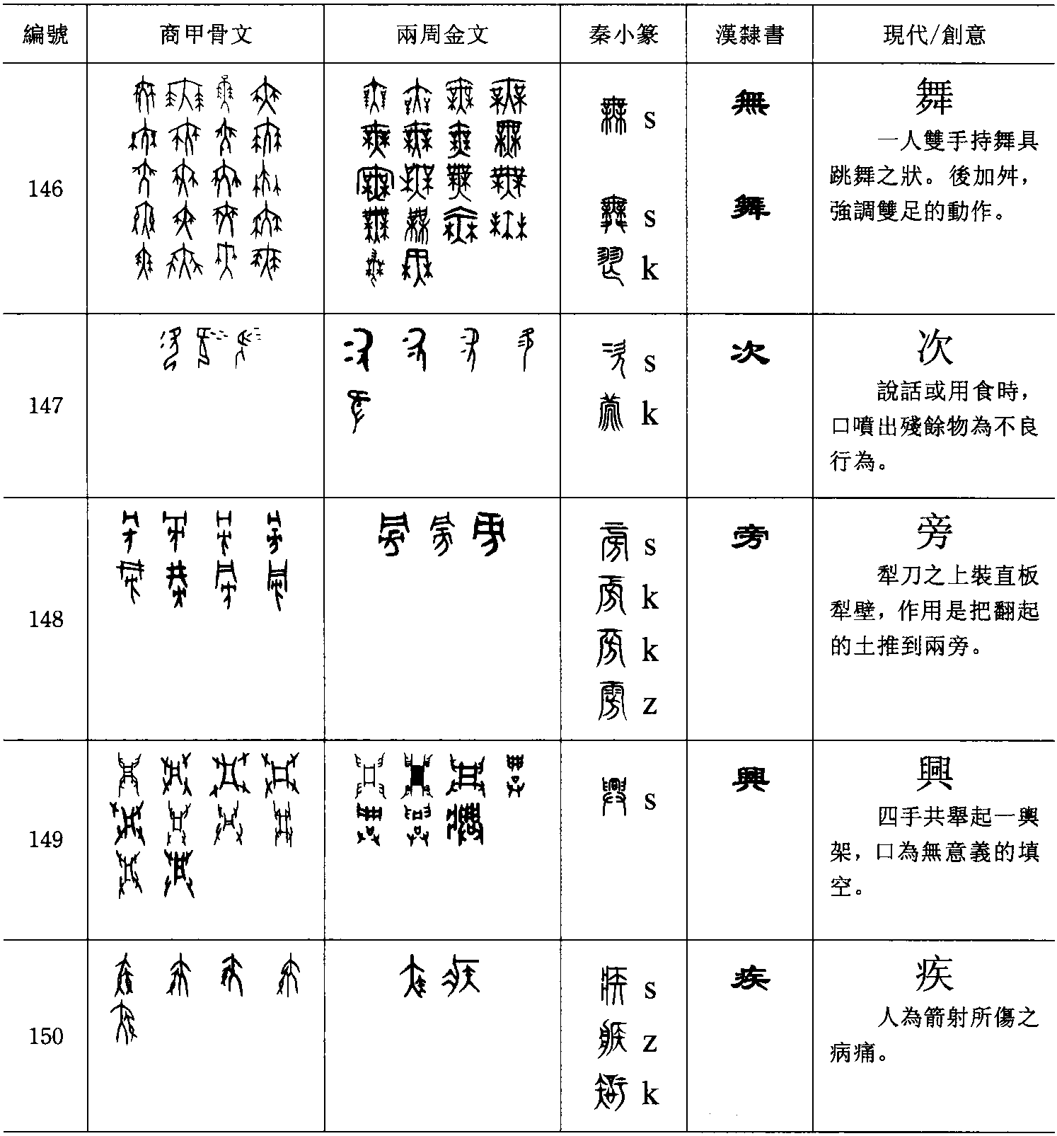 興(字149)【 ,興也。 从舁同, 同, 同力也】, 四手共舉起一輿架。輿架不成字。疾(字150)【 ,病也。 从疒,矢聲。 ,籀文疾。 ,古文】,人為箭所傷之病痛。疒(字151)【 ,倚也,人有疾痛也。 象倚箸之形。 凡疒之屬皆从疒。】,人病危臥於床上,預備接受合於禮儀的死亡儀式。衆(字152)【 ,多也。 从众目示意】, 以日下三人表達衆多的勞工大衆。步(字153)【 ,行也。 从止相背。 凡步之屬皆从步】, 以兩腳步行走的一前一後位置表達其走路動態。炙【 ,炙肉也。 从肉在火上。 凡炙之屬皆从炙】,表現肉在火上燒烤之狀。E. 兩個或更多的重複形體 林(字154)【 ,平土有叢木曰林。 从二木。 凡林之屬皆从林】,指生長林木衆多的地區,以並立的樹木表意。从(字155)【 ,相聽也。 从二人。 凡从之屬皆从从】, 一人在一人身後相隨之情況。比(字156)【 ,密也。二人為从,反从為比。 ,古文比】, 甲骨文从比不分。以一人隨從於一人之後表示其親密關係,或以兩把匙匕陳放在一起表達緊密關係。
