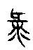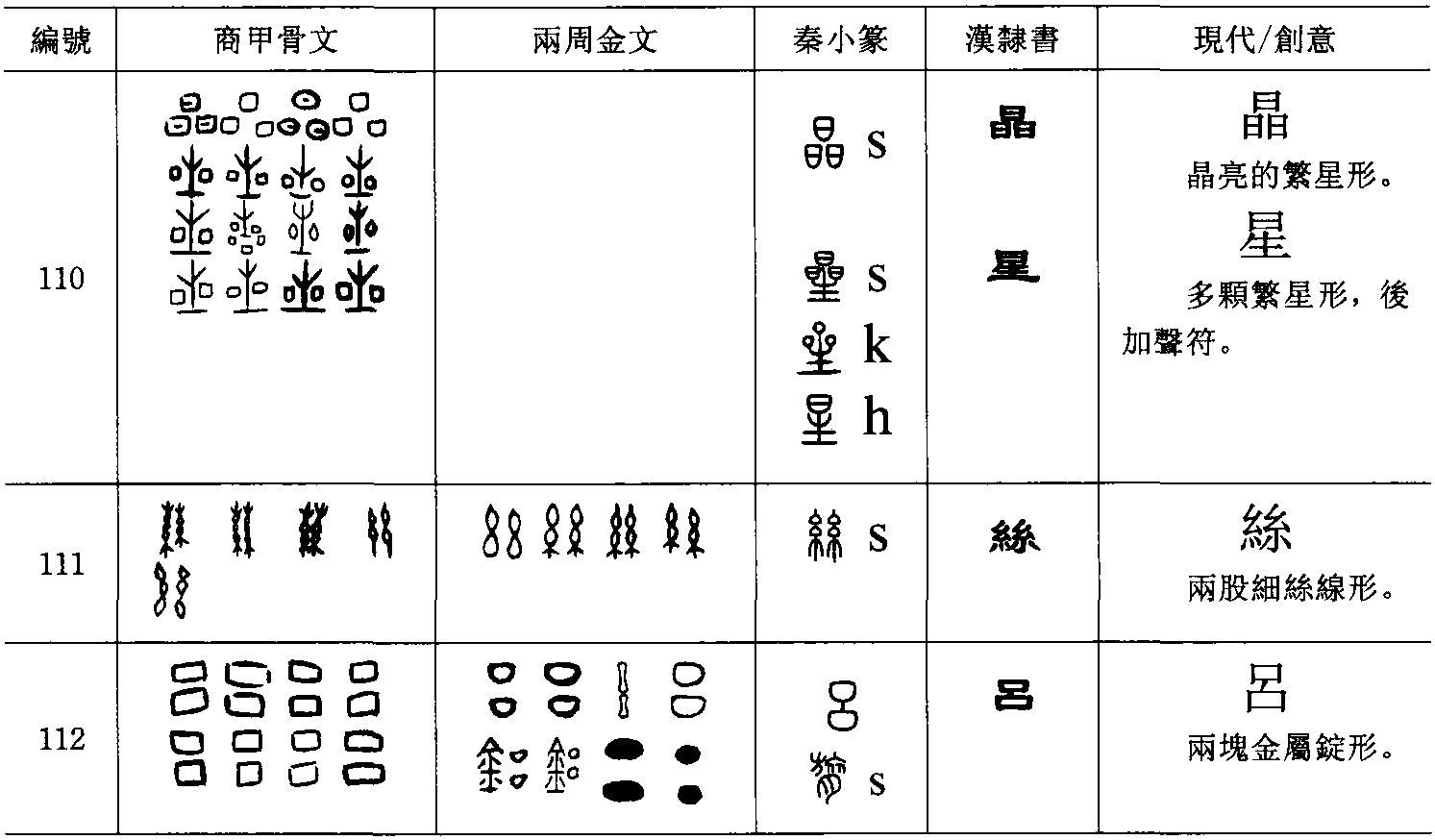 (c)重複形體 重複形體大都屬表意字。但偶有情況特殊,使用此法以指稱物象,如: 星(字110)【 ,精光也。 从三日。 凡晶之屬皆从晶】 【 ,萬物之精上為列星。从晶从生聲。一曰象形。从○。古○復注中,故與日同。 ,古文。 ,或省】,星體數量多,作三顆星形狀,避免與日或它物混淆。引申為晶亮,後來加聲符生以為分別。絲(字111) 【 , 蠶所吐也。 从二糸。 凡絲之屬皆从絲】, 絲線細,捻成線股後才能上機紡織,故以兩股造字。作為一字的構件時才用單股絲線。呂(字112) 【 , 脊骨也。 象形。 昔大嶽為禹心呂之臣, 故封呂侯。 凡呂之屬皆从呂。 ,篆文呂从肉旅聲】,象兩塊金屬錠形, 為避免與丁混淆而重複形體。後加金以明其物質的類別。宮字也因易與呂字混淆而加宀( )。