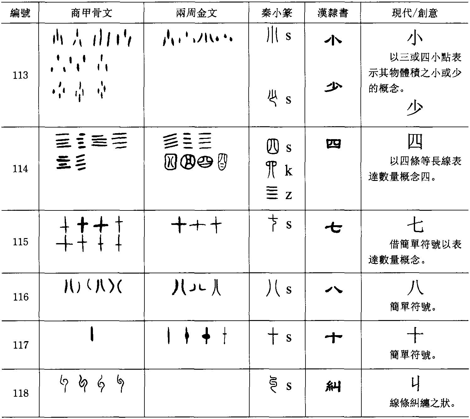 一【 , 惟初大極, 道立於一。 造分天地, 化成萬物。 凡一之屬皆从一。 ,古文一】、二【 ,地之數也。从耦一。凡二之屬皆从二。 ,古文二】、三【 ,數也。天地人之道也。於文,一耦二為三成數也。 凡三之屬皆从三。 , 古文三】、 四(字114)【 , 侌數也。 象四分之形。 凡四之屬皆从四。 , 古文四如此。 , 籀文四】, 以一、二、三、四等長之線條表達數量的概念。後來因為線條的數量可能起混淆,又分別造更為明確的字形。五【 ,五行也。 从二,侌昜在天地間交午也。 凡五之屬皆从五。 , 古文五如此】、六 【 , 易之數, 侌變於六, 正於八。 从入八。 凡六之屬皆从六】、七(字115) 【 , 昜之正也。 从一, 微侌從中衺出也。 凡七之屬皆从七】、八(字116)【 。 別也。 象分別相背之形。 凡八之屬皆从八】、十(字117) 【 , 數之具也。 一為東西, 丨 為南北,則四方中央備矣。凡十之屬皆从十】,借簡單符號以表達最常使用的數量概念。丩(字118)【 ,相糾繚也。 一曰, 瓜瓠結丩起。 象形。 凡丩之屬皆从丩】,兩段線條相糾纏之狀,表示糾纏的狀況。B. 單體的物體,它和象形字的不同點在於借形體以表達與該形體有關,但卻超乎該形體以外的概念,如: 秋(字50),甲骨文取象蝗蟲或蝗蟲受火烤,以秋季景象表達秋季。如以字形而論, 前形可歸於象形, 後者則必為表意字 ( )。大(字74),是一個大人的正視形象,表達與小孩相比的個體之大,重點是概念而非大人的形體 ( )。工(字119)【工,巧飾也。象人有規榘,與巫同意。凡工之屬皆从工。 , 古文工从彡】, 大致是象懸吊着的石磬形, 是攻字(字120)【 , 擊也。 从攴工聲。 】所敲打的器具形, 它是樂工所常敲打的樂器,故借用以表達樂工、工匠之意,也表達專業者的技術之工巧。𠂇 【 , 左手也。 象形。 凡𠂇之屬皆从𠂇】、又(字121) 【 , 手也。象形。三指者,手之列多略不過三也。凡又之屬皆从又】,以人的左右手的形象表達其所在的左與右的位置關係。且(字122)【 ,所以薦也。 从几, 足有二橫。 一, 其下地也。 凡且之屬皆从且。 ,古文以為且,又以為几字】 【 ,始廟也。 从示且聲】,男子性器象形,為人類繁殖的根源,就以之表達人倫的祖父。後借為語詞,乃加示而成祖以為分別。