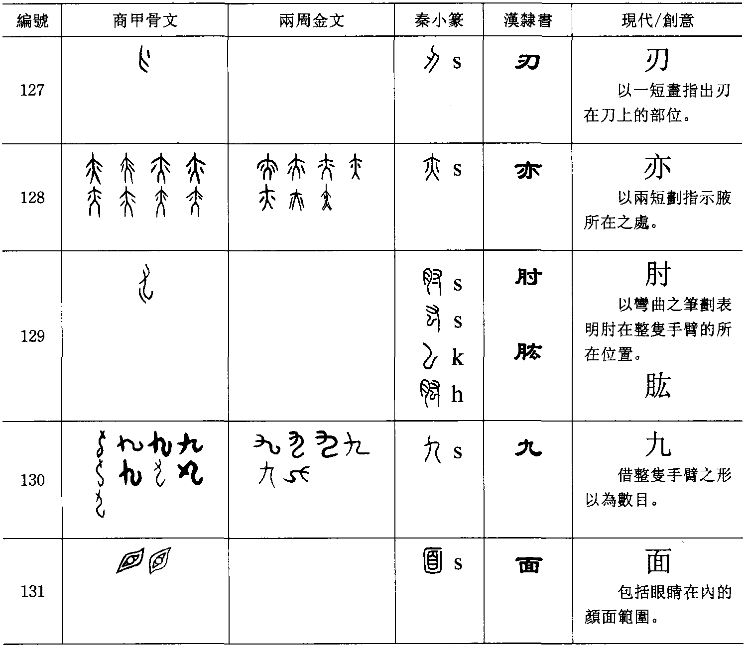 亦(字128)【 , 人之臂亦也。 从大, 象兩亦之形。 凡亦之屬皆从亦】,以兩短劃指示腋在人體所在之處。肘(字129) 【 , 臂節也。 从肉寸。 寸, 手寸口】 【 , 臂上也。从又从古文厷。 , 古文厷, 象形。 ,左或从肉】, 以彎曲之筆劃表明肘在整隻手臂的所在位置。從甲骨文的字形看應是肱字,但就形象的表現看應是肘字。 數目字九(字130)【 , 昜之變也。 象其屈曲究盡之形。凡九之屬皆从九】可能借整隻手臂形之音表達。肘與肱兩字的使用可能有所混亂。面(字131)【 ,顏前也。 从𦣻, 象人面形。 凡面之屬皆从面】,圓圈呈現顏面的輪廓,眼睛是面部表情最生動者,輔助表明輪廓為人的顏面。也有可能把人的身子畫出來,強調人的顏面。彭(字132)【 ,鼓聲也。 从壴从彡】, 表達短促有力的聲音, 加鼓表明所發之音響。