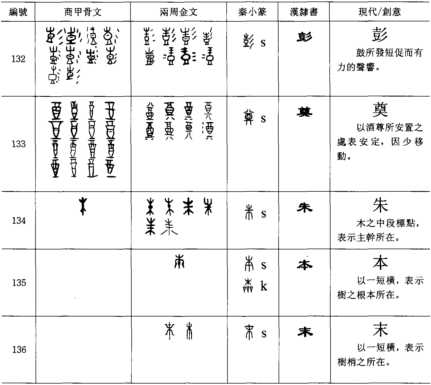 奠(字133) 【 , 置祭也。 从酋。 酋酒也。 丌其下也。 禮有奠祭】,酒尊所安置之處,一橫或可能表示運輸時所放置的架子。大酒尊(大汶口的陶水缸高60公分,固定一地難移動)固定安置於某處,不像其它用具經常被搬動。朱(字134)【 , 赤心木, 松柏屬。 从木, 一在其中】, 木之中段標上一短橫,表示主幹所在。本(字135)【 , 木下曰本。 从木从丅。 , 古文】、末(字136)【 ,木上曰末。 从木从丄】, 分別以一短橫, 表示樹之本、末所在位置。身(字137)【 , 躬也。 从人申省聲。 凡身之屬皆从身】, 畫出人身腹部的所在。