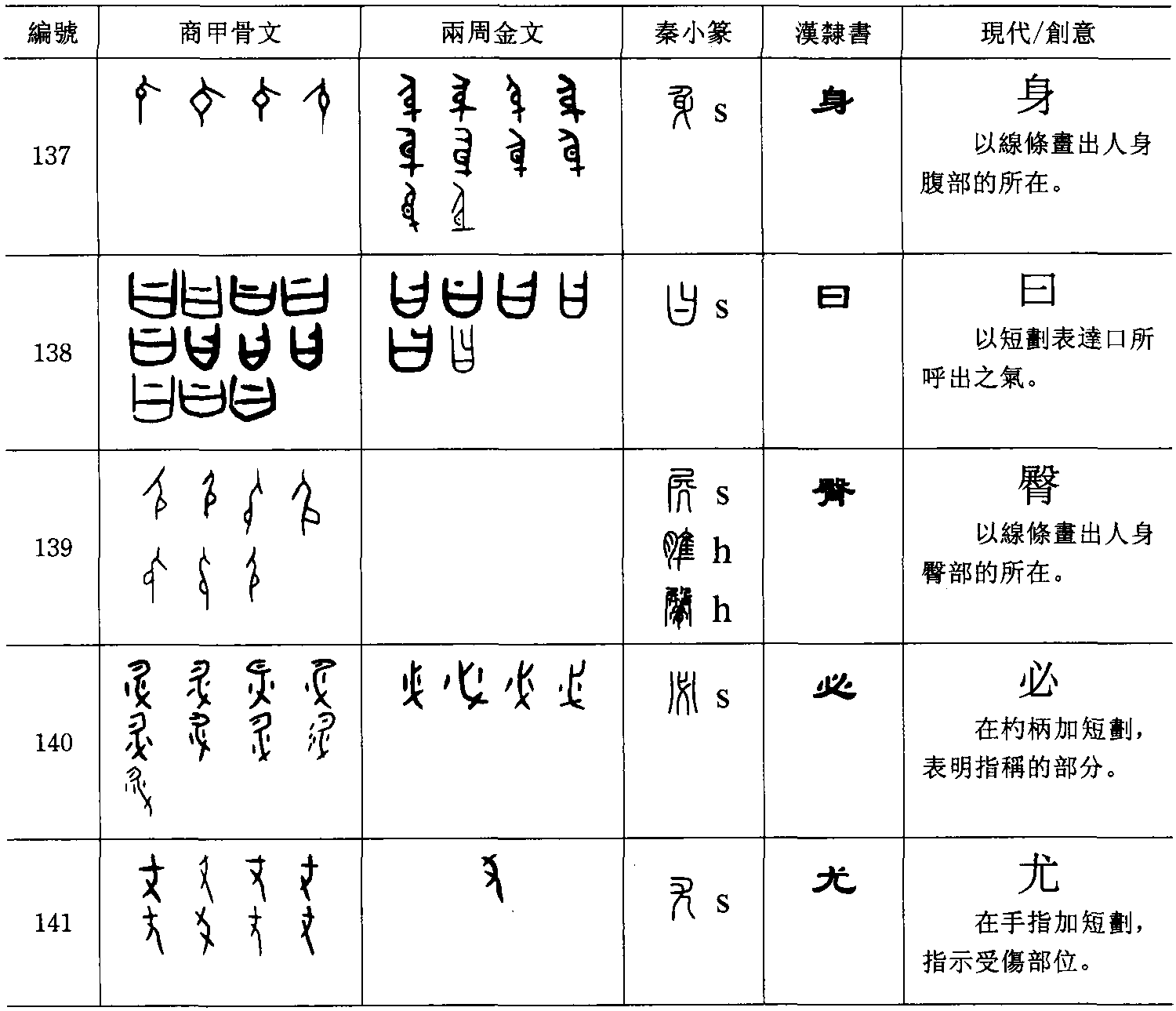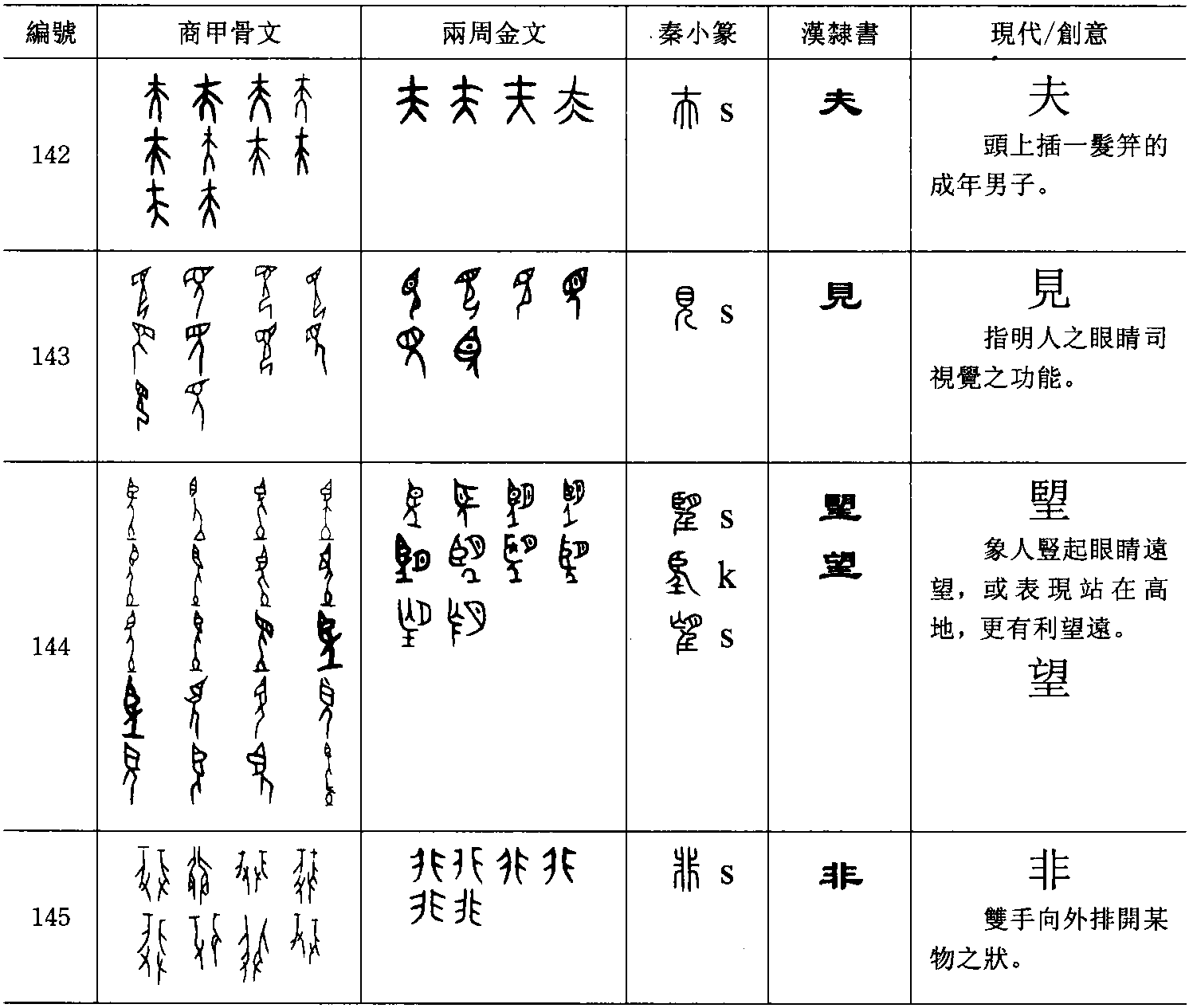 沬(字34),一人臨盆雙手洗臉之狀,金文改以雙手持皿倒水於一人之沐浴狀。貴族可能因經常舉行祭祀而要沐浴潔身,一般人較少沐浴,故以貴族形象創字 ( )。正(字35), 腳所面對的都邑, 為征伐的對象 ( )。邑(字47),人跪坐居息的範圍,為居住區,非耕種的田地 ( )。長(字59), 一人髮長之狀 ( )。夫(字142)【 , 丈夫也。 从大一。 一以象簪。 周制, 八寸為尺,十尺為丈。人長八尺,故曰丈夫。凡夫之屬皆从夫】,大為大人正立之形,一橫短畫為骨笄的形象,成人因結髪才需要以笄固定髪型,故用以表達已成年的男子。見(字143)【 ,視也。从目儿。凡見之屬皆从見】,指明人之目司視覺之功能。
