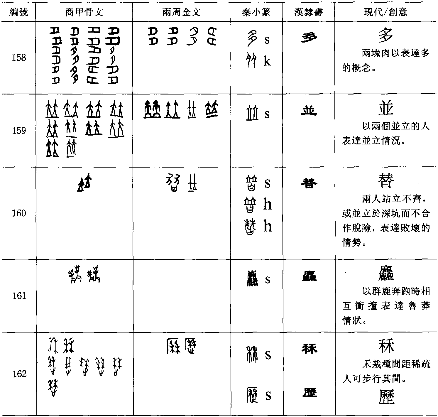 並(字159)【 , 併也。 从二立。 凡並之屬皆从並】, 以兩個並立的人表達類似的並立情況。替(字160) 【 , 廢也。 一偏下也。 从並, 白聲。 , 或从曰。 ,或从兟从曰】, 白為唇聲字, 替為舌尖聲, 替不該以白為聲符。《說文》的解說“一偏下”對該應兩立不齊的字形,以兩人站立的位置不齊有失威儀以表達敗事的情勢。但卻沒有該字形,顯然有脫文。金文的另一形作並立於深坑內之狀,大致表達如不知權變,如爬上另一人的肩上以脫逃,不相互合作以求脫險是為敗事。麤(字161)【 ,行超遠也。 从三鹿。 凡麤之屬皆从麤】, 以二或三鹿表達類似群鹿奔跑時相互衝撞之魯莽狀。秝(字162)【 , 稀疏適秝也。 从二禾。 凡秝之屬皆从秝。 讀若歷】,兩行禾之狀。禾的栽種不能太密集,人可步行其間,以之表達稀疏之狀況。