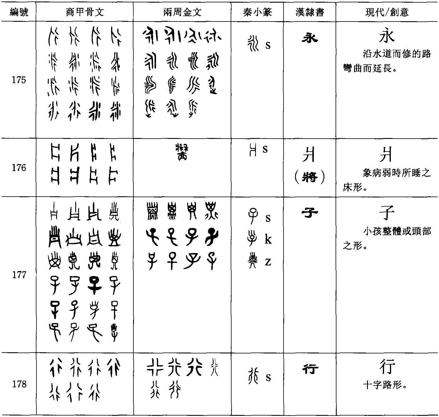 G.字形變易位置 都是較晚期於分析字形之後所創。 正(字35)、乏(字35): 正為征的初形,假借為正確。城邑的口字形訛變成一,小篆乏的創意有可能是反正的字形而來( )( ) 。永(字175) 【 , 水長也。 象水巠理之長永也。 詩曰: 江之永矣。凡永之屬皆从永】、𠂢 【 , 水之衺流別也。 从反永。 凡𠂢之屬皆从𠂢。讀若稗縣】,永為沿水道而修的路, 彎曲而長延。 衍【 , 水朝宗于海皃也。 从水行】、洐 【 , 溝行水也。 从水行】的創意與之相似, 沿水道而修的路長延 ( )。商周時代文字常反正不別, 反永成𠂢以表達斜分之派流為後來的意義。