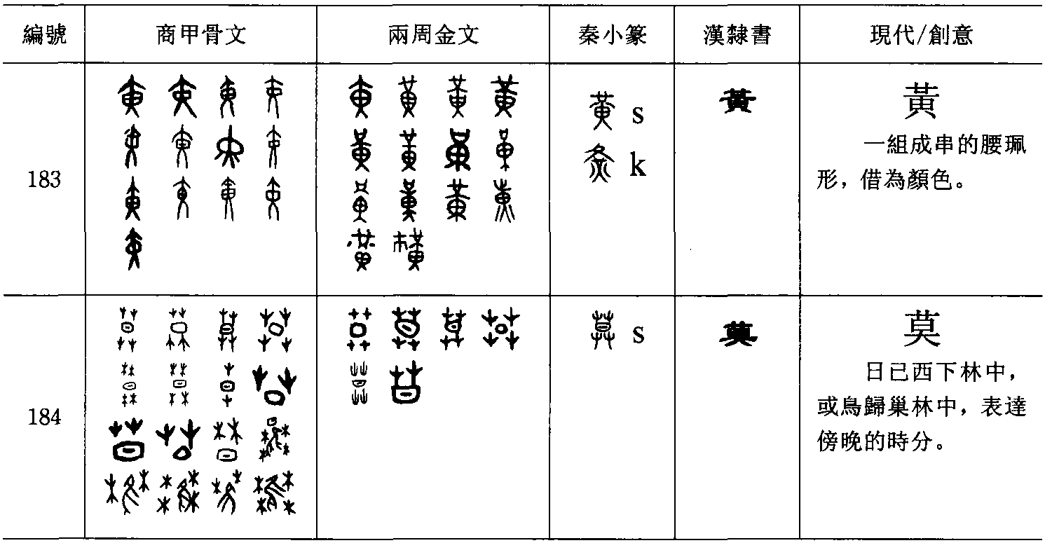 同樣的,莫(字184)【 , 日且冥也。 从日在茻中, 茻亦聲】本象日已西下於林中的傍晚時分,作鳥於林中,表達其歸巢的時間。春秋時代莫被借用為否定副詞,因此就在本義的莫字加上日的意符而成暮字。很多假借字就通過這個步驟而成為形聲字。有時為了音讀的便利,或修正已發生變化的音讀,就加上新的聲符,也形成形聲字,譬如,甲骨文的風字(字21)是借用鳳鳥的象形字( ), 後來在鳳形上加凡或兄的聲符以為區別 ( )。 但是這個新的形聲字又被用為鳳鳥的意義,就別造現在从虫凡聲的風字。又如甲骨文的晶字(字110)本是繁星的象形 ( ), 它兼有晶亮的引申義, 於是在晶上加生的聲符而成為星字 ( ), 以與晶字區別。 有時一個字已因聲讀的關係借用為其他意義,因某種原因又標上一個音符,使得整個字都由音符構成, 如羽(字29)是羽毛的形象 ( ), 商代借為翌日, 加上立的聲符 ( ), 戰國時羽更借為音樂宮調的名稱, 而又加上于聲( )。 一個形聲字不管是加上聲符或意符而形成的, 在形式上, 它們絕大部分都可分析為與意義有關的形符以及與音讀有關的聲符,只有少數純由聲符組成。由於純由聲符組成的字不多,故都歸於一類,統名形聲字。如上所述,大部分早期的形聲字是象形或表意字經過了長期的使用,才在不知不覺中演變成的。人們一旦察覺這種簡便的造字法,就有意以這種形式大量創造新字。最早有意創造的形聲字可能是族名、地名、動植物一類很難用圖畫去表達的專有名詞,稍後才推廣到其他詞彙的領域,終於成為後世最廣泛應用的造字法。 依其形成的過程,形聲字約可分為三式: A. 聲加形符: (a)由假借而來 彔(字27)加林=麓【 ,守山林吏也。一曰林屬於山為麓。春秋傳曰,沙麓崩。 ,古文從彔】,汲水的轆轤形,借為山麓 (![]() )。須(字94)加髟=鬚 【《廣韻》,鬚,俗】,臉上鬍鬚,借為副詞( )。丑(字125)加手=扭 【《廣韻》,扭,按也】,手指彎曲以扭物,借為干支 ( )。非(字145)加手=排【 ,擠也】,雙手排東西往兩旁,借為副詞( )。黃(字183)加玉=璜 【 , 半璧也】, 成串之腰珮形, 借為顏色( )。莫(字184)加日=暮 【《廣韻》,暮,日晚也。冥也】,日已西下林中,借為副詞 ( )。采(字185)【 ,捋取也。从木从爪】加手=採【《廣韻》,採,取也。俗】,手採樹上果實,借為光彩。父(字186)【 ,巨也。家長率教者。从又舉杖】加斤=斧【 所以斫也。从斤父聲】,手持石斧,借為親屬。