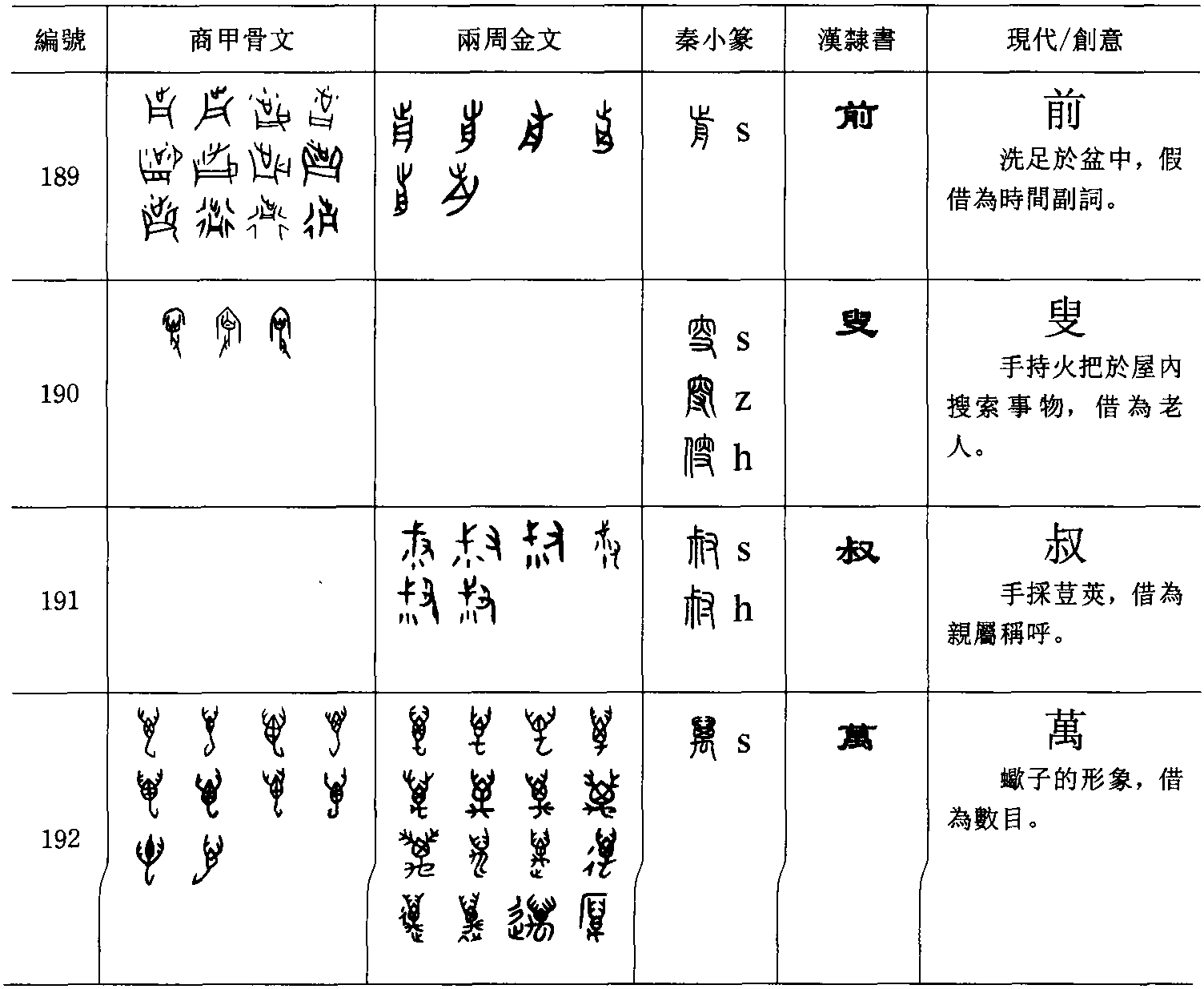 原(字187)【 ,水本也。 从灥出厂下。 , 篆文从泉】加水=源【《廣韻》,源,水原曰源】,泉水湧出的源頭,借為平原。縣(字188) 【 , 繫也。 从系持𥄉。 】加心=懸 【《廣韻》, 懸,俗,今通用】,懸掛頭顱於樹上,借為行政單位。前(字189) 【 , 不行而進謂之歬。 从止在舟上】加水=湔【《廣韻》,湔,洗也。一曰水名,出蜀玉壘山】,洗足於盆中,借為時間副詞。叟(字190)【 ,老也。 从又灾。 ,籀文从寸。 , 叟或从人】加手=搜 【搜,眾意也。一曰求也】,持火把於屋內搜索,借為老人。叔(字191)【 , 拾也。 从又尗聲。 汝南名收芋為叔。 , 叔或从寸】 【 , 豆也。 尗象豆生之形也。 凡尗之屬皆从尗】加艸=菽【《廣韻》,尗,豆也。菽,上同】,手採豆莢,借為親屬稱呼。萬(字192)【 ,蟲也。 从禸。 象形】加虫=蠆【 ,毒蟲也。 象形。 ,蟇或从䖵】,蠍子形,借為數字。